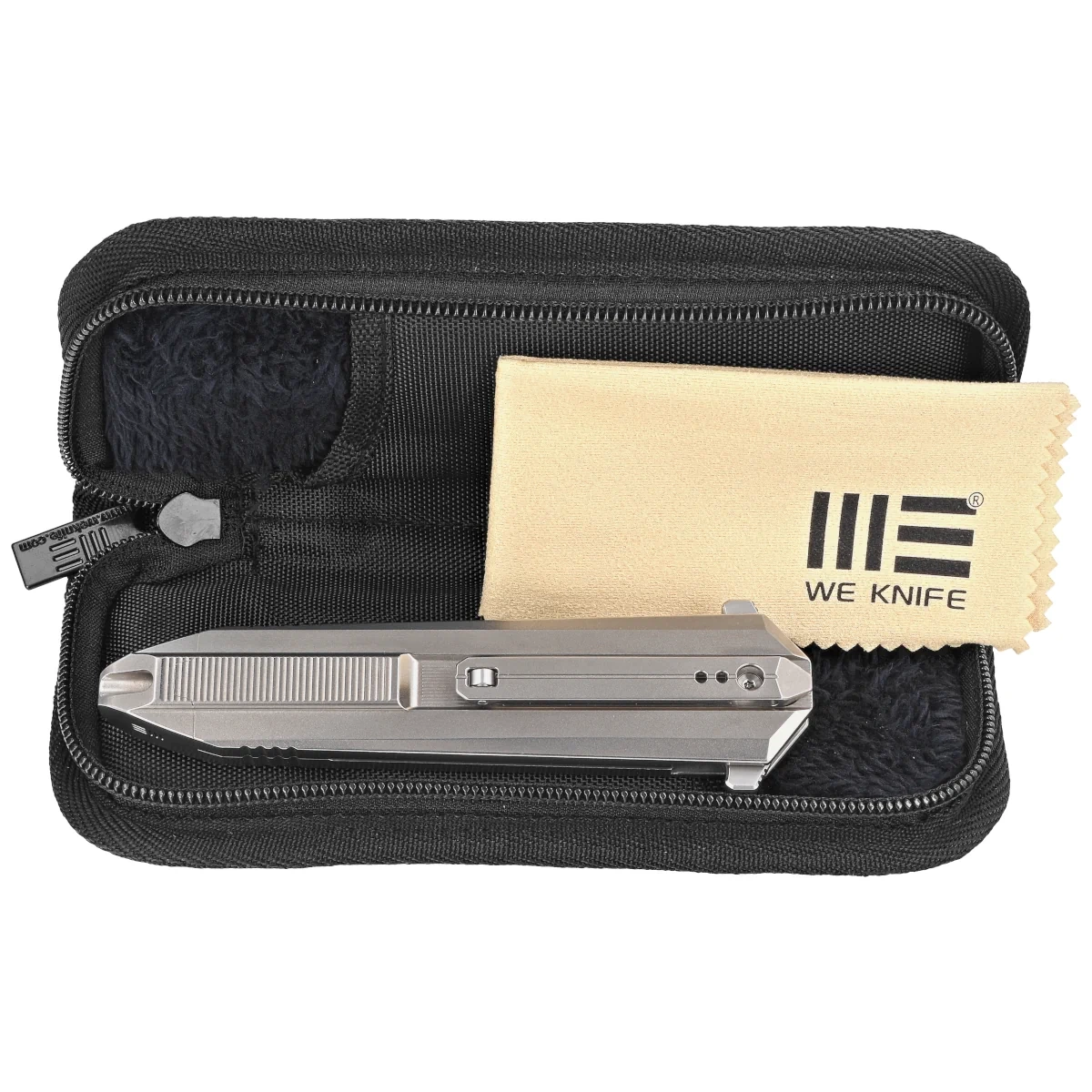 Rękojeść - to popis innowacyjności inzynierskiej projektantów z WeKnife. Dwa kawałki tytanu 6AL4V, pięknie frezowane łączy na końcu tytanowa nasadka z jednego kawałka tytanu. Dzięki temu rękojeść zachowuje niebywałą sztywność i odporność. Tylko nieliczne firmy są w stanie wykonać rękojeść z tak nieprawdopodobną dokładnością! Kolejna innowacja to umieszczone symetrycznie po obu stronach noża klipsy do przenoszenia. Koniec z odkręcaniem śrubek i przekładaniem, nóż możemy nosić po prawej i lewej stronie w tej samej pozycji. Dodatkowym smaczkiem jest zakończenie klipsów rolką, dzięki czemu ułatwione jest wsuwanie i zaczepianie noża o brzeg materiału.