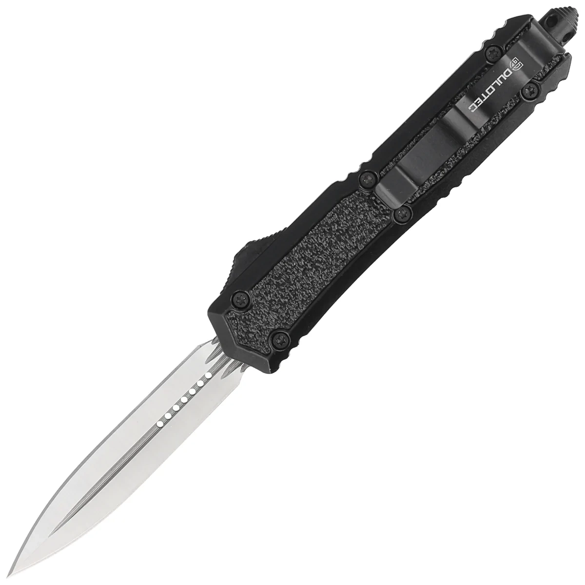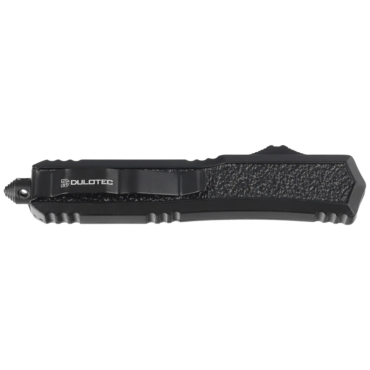 Dulotec OTF Black Aluminium, Satin, nóż automatyczny OTF (Out The Front) z głownią wysuwaną z przodu dzięki mocnej sprężynie. Pracuje w trybie D/A (Double Action) czyli za pomocą suwaka wysuwamy i chowamy ostrze. Projekt łączy czyste, nowoczesne linie z taktycznymi korzeniami. Mocna budowa, niezawodność działania oraz rozsądna cena to tylko nieliczne z zalet automatu. Bestseller!