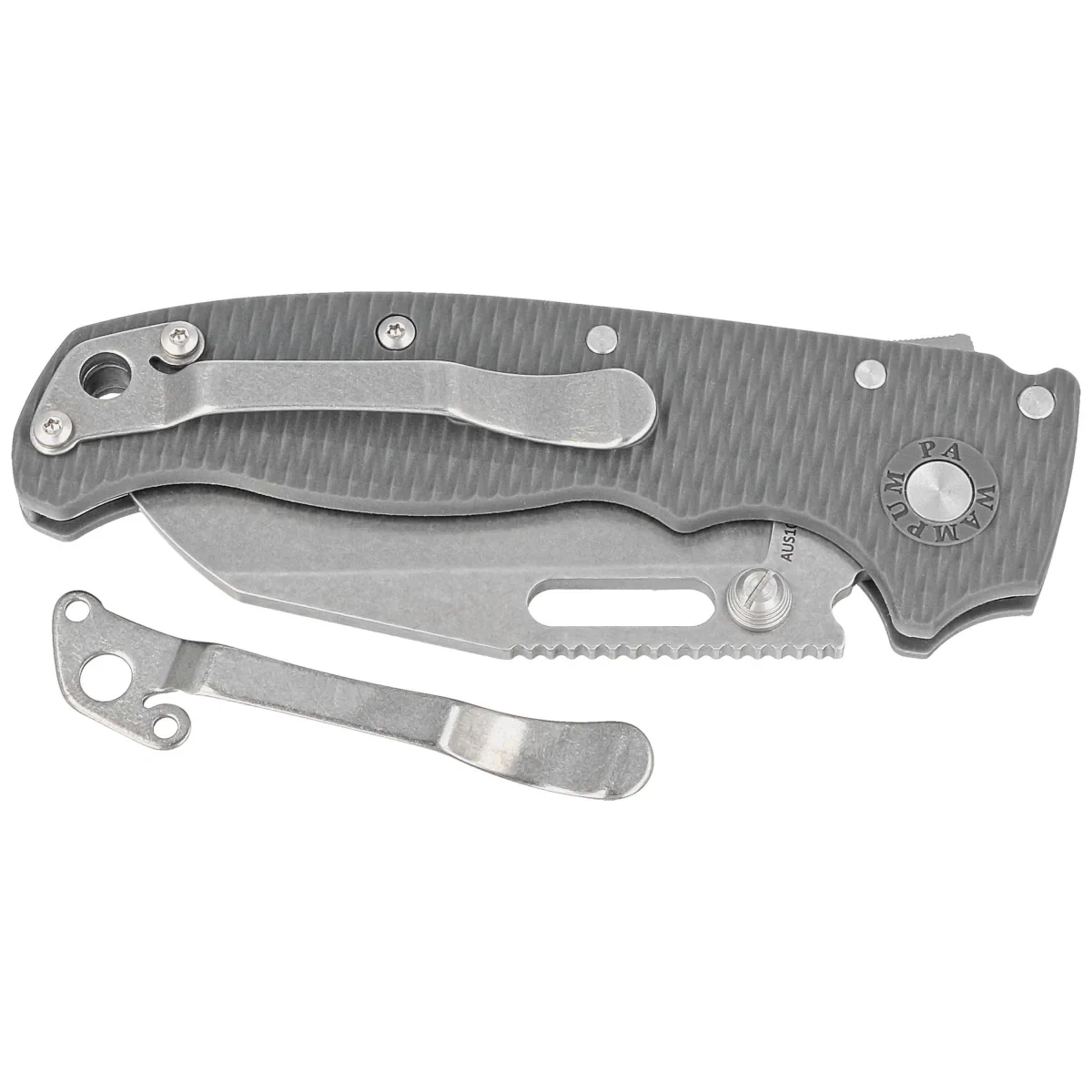 Rękojeść - okładziny z Grivory, praktycznie niezniszczalnego tworzywa niewrażliwego na warunki atmosferyczne, odpornego na chemikalia i uszkodzenia mechaniczne. Fazowane krawędzie okładek eliminują ostre ranty a charakterystyczne teksturowanie powierzchni poprawia pewność uchwytu. Jednopozycyjny, prawostronny klips umożliwia przenoszenie noża w pozycji tip-up, czubkiem ostrza ku górze. W zestawie dodawany jest klips dla leworęcznych.