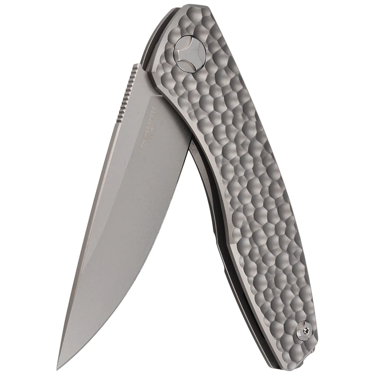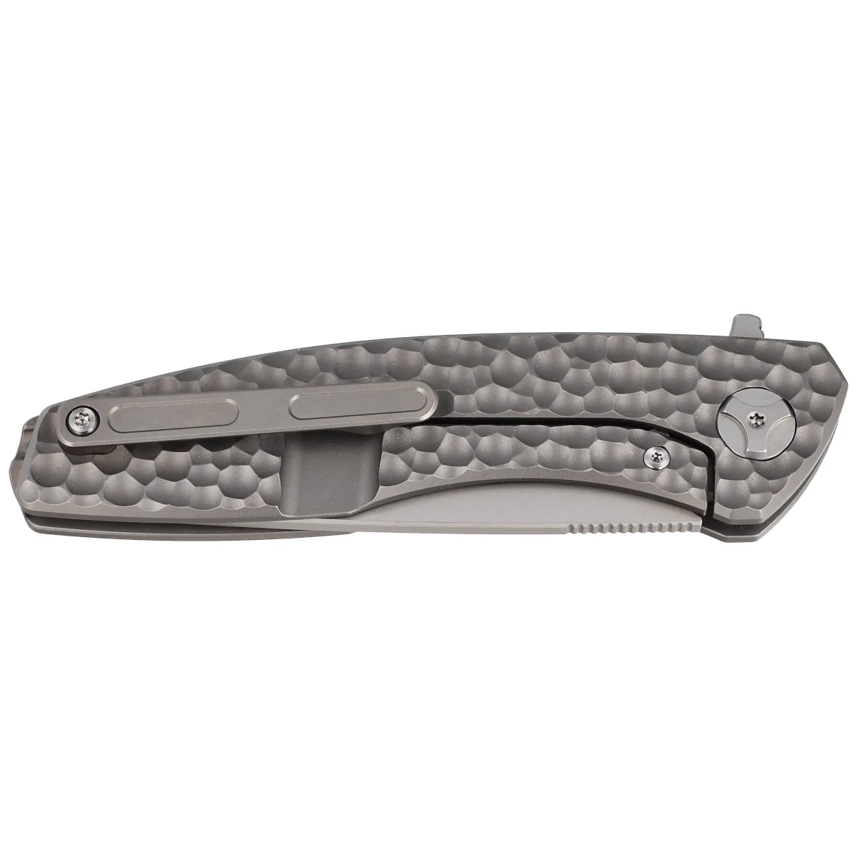 Rękojeść - okładziny z litego tytanu TC4. Fazowane krawędzie okładek eliminują ostre ranty a groszkowana faktura okładzin poprawia pewność uchwytu. Masywny backspacer do którego przymocowano okładziny gwarantuje sztywność i wytrzymałość całej konstrukcji. Prosta, solidna budowa daje pewność wieloletniego użytkowania. Dwupozycyjny (prawa/lewa) klips deep carry pozwala przenosić dyskretnie nóż w kieszeni w pozycji tip-up (czubkiem ostrza do góry).