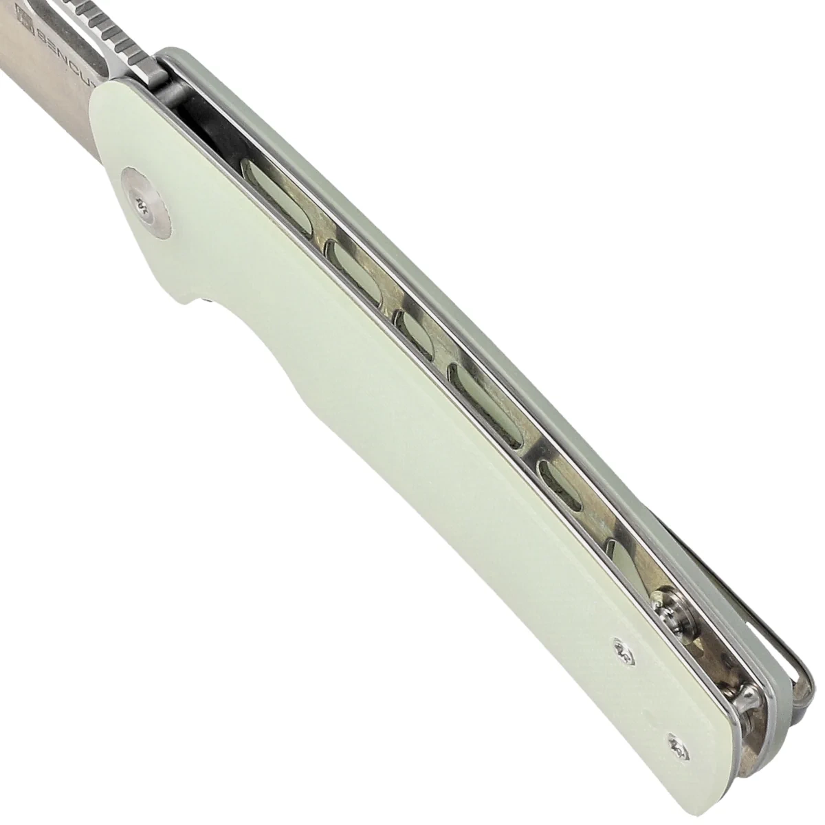 Rękojeść - wykonana z G10, kompozytowego materiału z włókna szklanego prasowanego pod ciśnieniem z syntetyczną żywicą. Fazowane krawędzie okładek eliminują ostre krawędzie dla wygody, a podcięcie na palec (fore finger groove) poprawia pewność uchwytu. Otwarta konstrukcja tzw. open-backed mocowana stalowymi tulejami dystansowymi redukuję wagę oraz ułatwia czyszczenie. Dwupozycyjny, prawo/lewostronny klips deep carry pozwala przenosić dyskretnie nóż w kieszeni w pozycji tip-up (czubkiem ostrza ku górze).