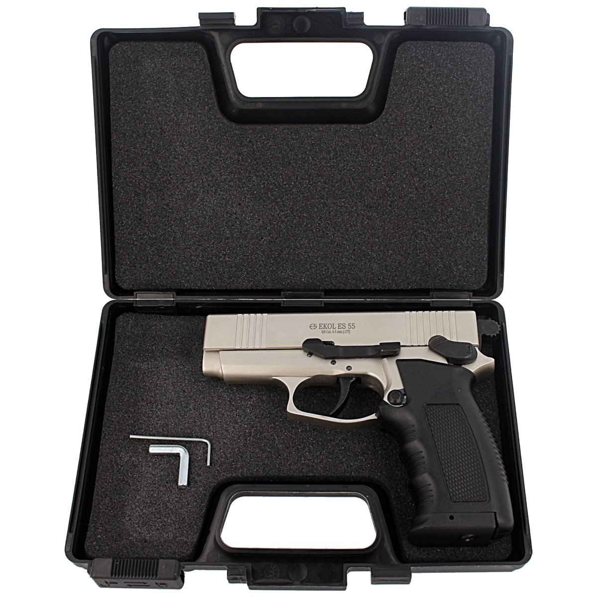 - Ekol ES 55 Satynowy - samopowtarzalny pistolet pneumatyczny o konstrukcji opartej na broni sygnałowej. Dzięki tak silnym korzeniom, ten potężny pistolet o prędkości 140 m/s nadaje się do dynamicznego strzelectwa i treningu taktycznego. Metalowy szkielet.