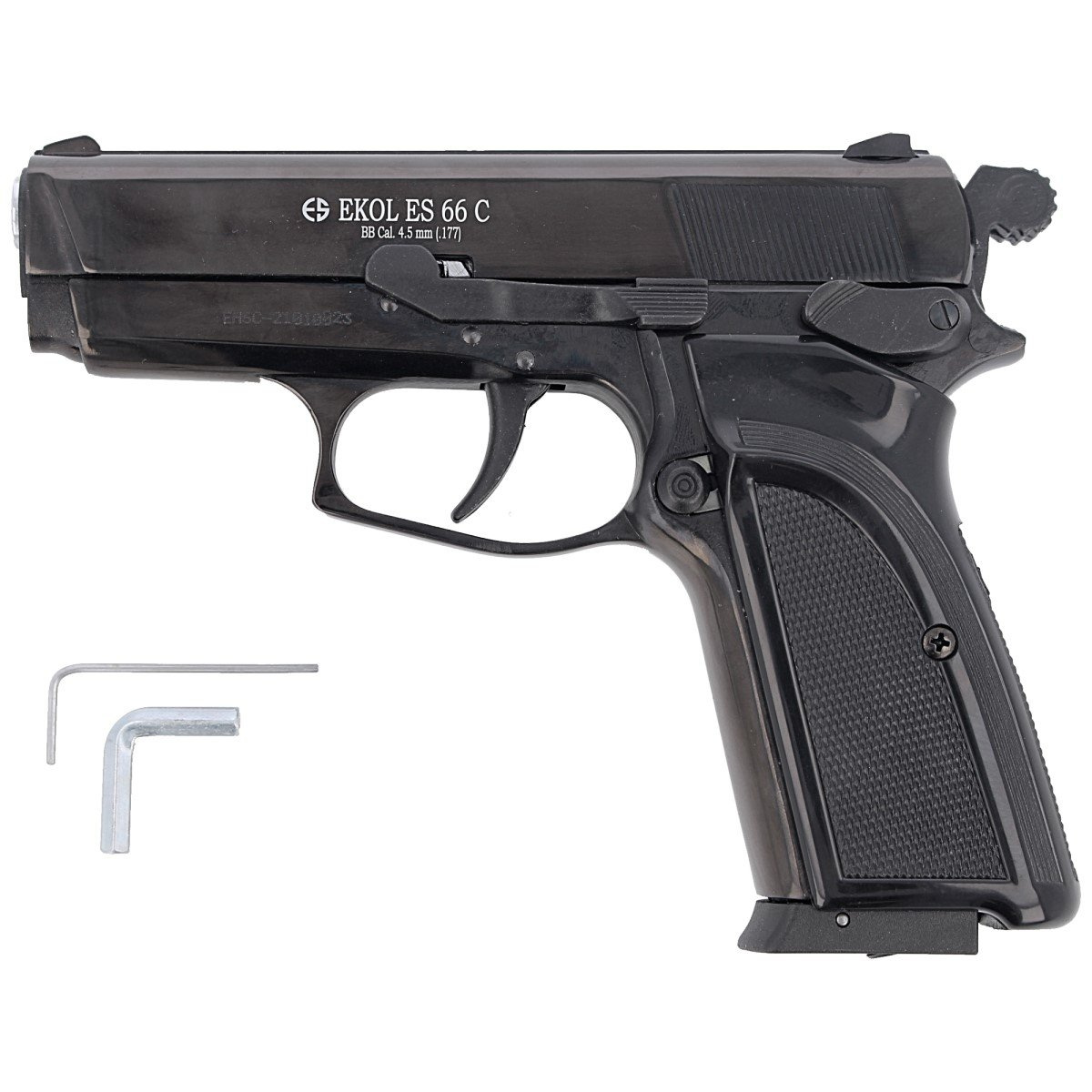 - Ekol ES 66C Czarny - kompaktowy, samopowtarzalny pistolet pneumatyczny oparty konstrukcyjnie na broni sygnałowej. Dzięki silnym korzeniom, ta mocna wiatrówka 140 m/s nadaje się do dynamicznego strzelectwa i treningu taktycznego. Metalowy szkielet.
