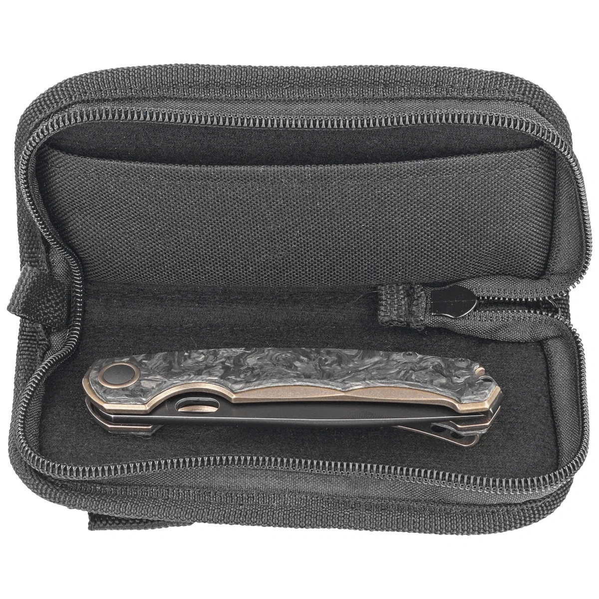 Rękojeść - z frezowanego obrabiarkami CNC litego tytanu Gr.5 Ti6AI4V wykończone warstwą Marble Carbon Fiber. Fazowane krawędzie okładek eliminują ostre krawędzie dla wygody chwytu. Solidny backspacer zapewnia sztywność i solidność całej konstrukcji. Jednopozycyjny (prawa) klips deep carry umożliwia przenoszenie noża w pozycji tip-up, czubkiem ostrza ku górze. Nad klipsem otwór do przewleczenia linki zabezpieczającej lub ozdobnej.