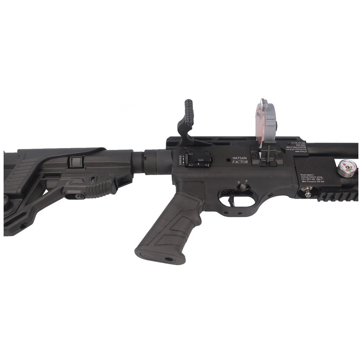 • Factor potężny karabin PCP od Hatsan. Wyposażony w dźwignię napinania Side Lever, regulator mocy strzału, pokrętło regulacji mechanizmu spustowego, lufę ze zintegrowanym tłumikiem dźwięku QE. Dostępny w kalibrach .177 (4.5 mm), .22 (5.5 mm), .25 (6.35 mm)