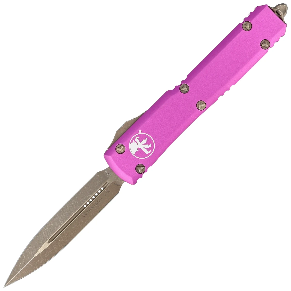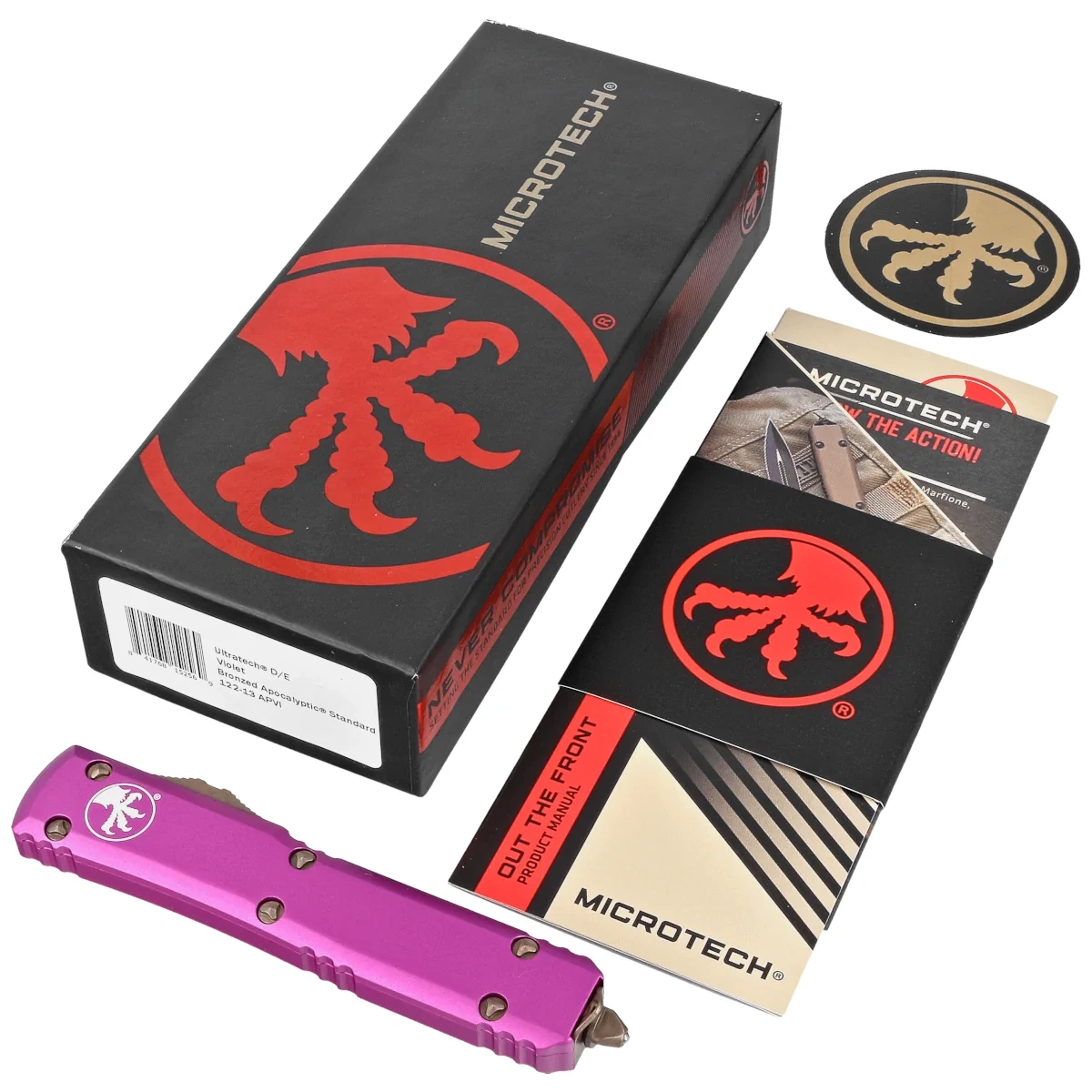 - Ultratech D/E Violet Aluminium, Bronzed Apocalyptic to pełnowymiarowy nóż automatyczny OTF z serii Ultratech. Pracujący w trybie D/A, wyposażony w piekielnie szybki mechanizm wysuwający ostrze. Projekt Tony Marfione właściciela Microtech Knives