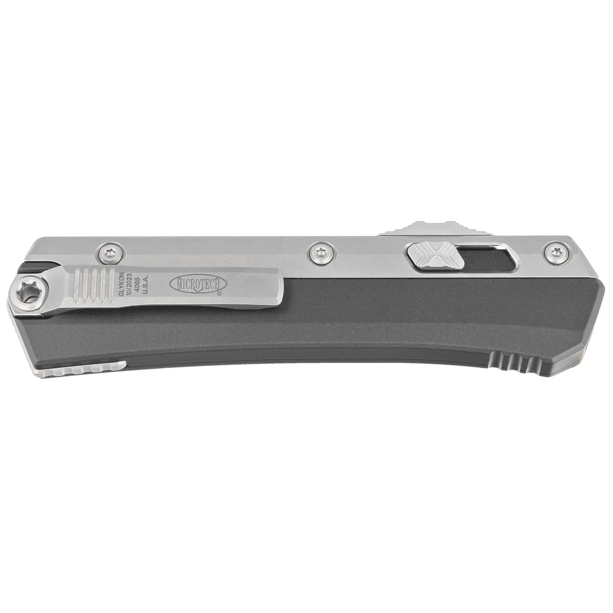 Rękojeść - wykonana z doskonałą precyzją w technologii 3D na frezarkach CNC, dolna część z anodyzowanego na czarno aluminium 6061-T6, górna część z piaskowanego tytanu. Faktura powierzchni rękojeści powoduje, że nóż nie ślizga się w dłoni podczas używania. Na grzbiecie i dole rękojeści znajdują się nacięcia (jimping) dla pewniejszego chwytu. Ergonomiczny profil oraz frezowany dwupozycyjny (prawa/lewa) masywny klips typu deep carry, umożliwiają dyskretne przenoszenie noża w kieszeni, w pozycji tip-down (czubkiem ostrza do dołu). Na klipsie znajduje się logo Microtech, numer seryjny i data produkcji.