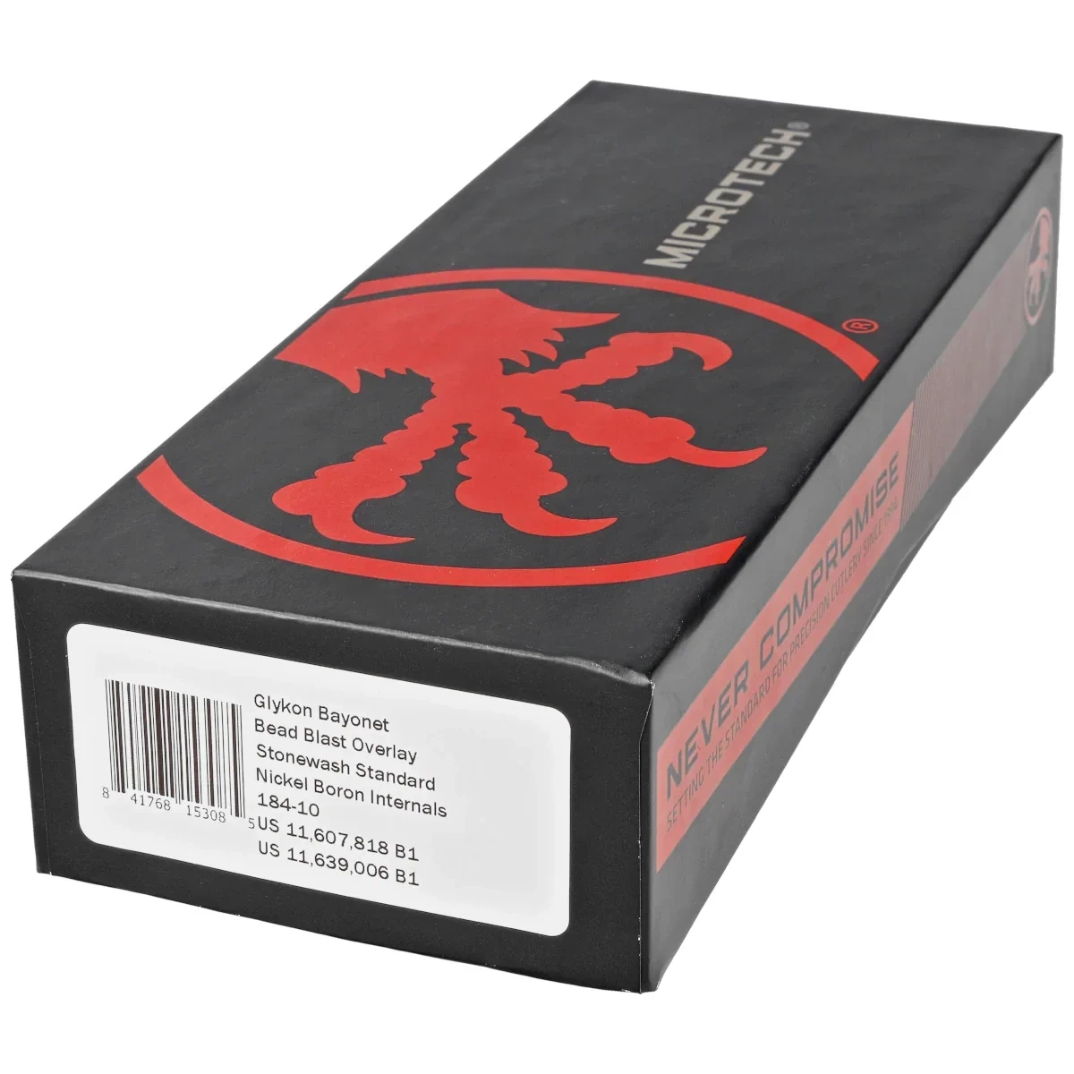 Glykon D/E Bayonet Black Aluminium / Bead Blast Titanium, Stonewashed to duży nóż automatyczny OTF (Out The Front) z serii GlykonPierwszy automat OTF z trójstronnym przyciskiem, umożliwiającym pełną obsługę oburęczną, wyposażony w piekielnie szybki mechanizm wysuwający ostre jak brzytwa ostrze. W 100% wyprodukowany i zmontowany w USA. Projekt Anthony'ego i Seana Marfione Microtech Knives.