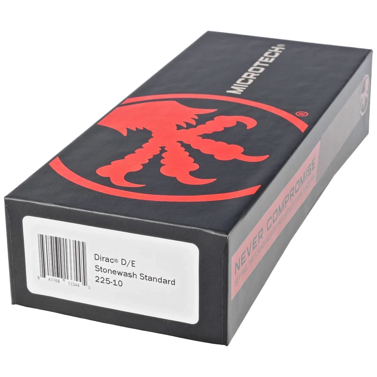 Dirac D/E Black Aluminium, Stonewashed to kompaktowy nóż automatyczny OTF z serii Dirac. Pracujący w trybie D/A, wyposażony w piekielnie szybki mechanizm wysuwający ostrze. Przycisk slidera na boku rękojeści. W 100% wyprodukowany i zmontowany w USA. Projekt Anthony'ego Marfione, knifemakera i właściciela Microtech Knives.