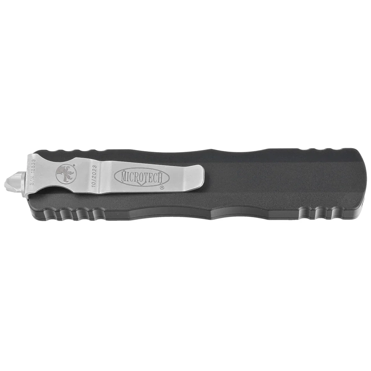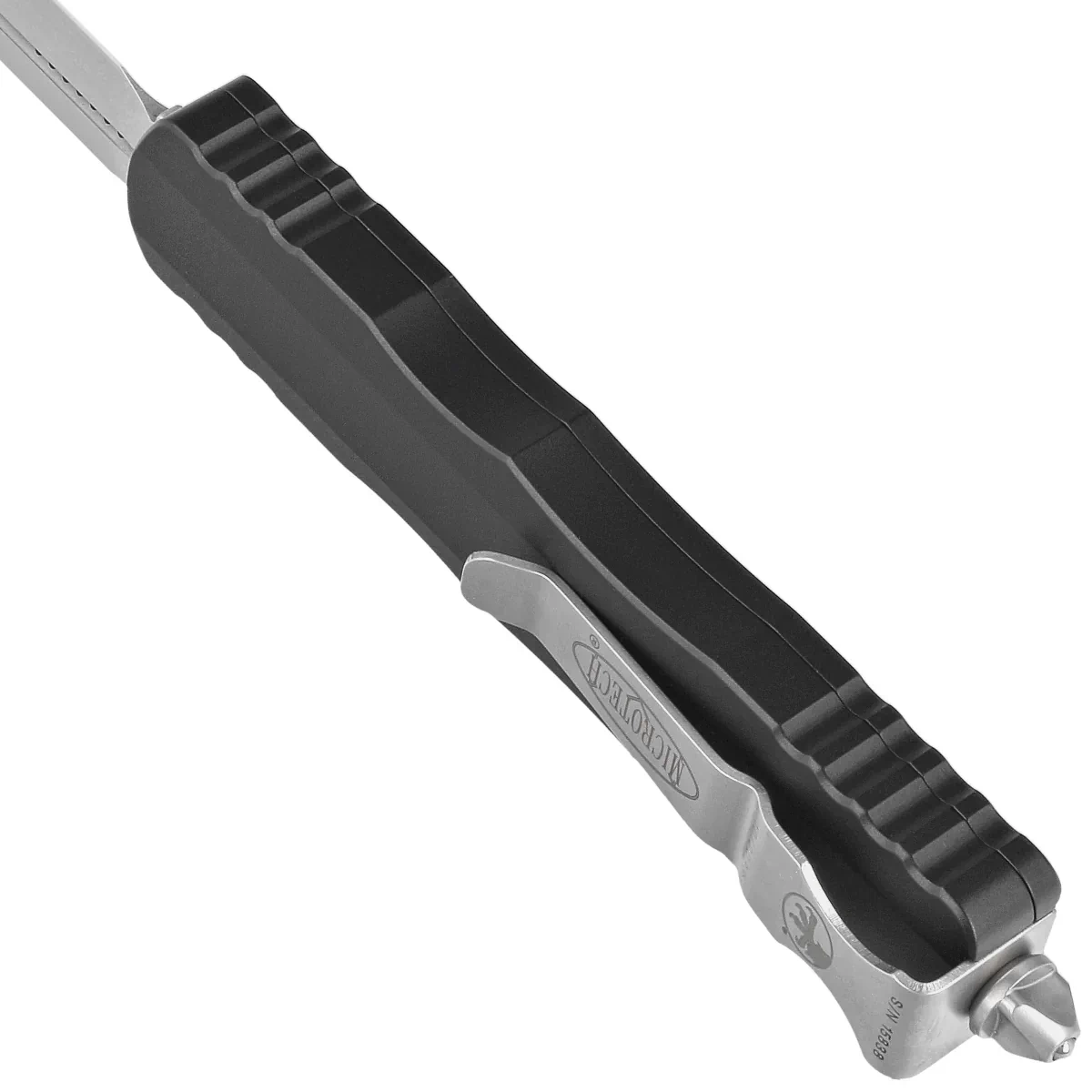 Rękojeść - wykonana z doskonałą precyzją w technologii 3D na frezarkach CNC, z anodyzowanego na czarno aluminium 6061-T6Faktura powierzchni rękojeści powoduje, że nóż nie ślizga się w dłoni podczas używania. Na grzbiecie i dole rękojeści znajdują się nacięcia (jimping) dla pewniejszego chwytu. Charakterystyczne jest umiejscowienie suwaka slidera, w zagłębieniu wyfrezowanym na boku rękojeści. Dzięki temu ręka układa się naturalniej przy otwieraniu i zamykaniu noża. Smukły profil oraz frezowany dwupozycyjny (prawa/lewa) masywny klips typu deep carry, umożliwiają dyskretne przenoszenie noża w kieszeni, w pozycji tip-down (czubkiem ostrza do dołu). Na klipsie znajduje się logo Microtech, numer seryjny i data produkcji. Rękojeść zakończono zbijakiem do bicia szyb, masywny stalowy trójkąt, w który wprasowano kulkę z węglika wolframu.