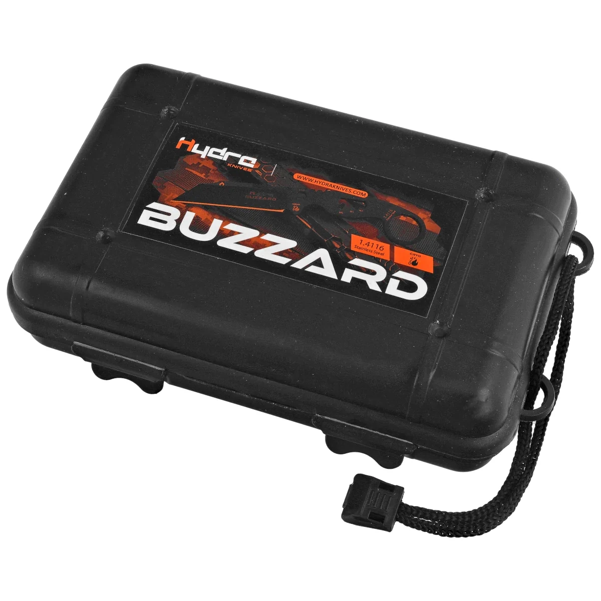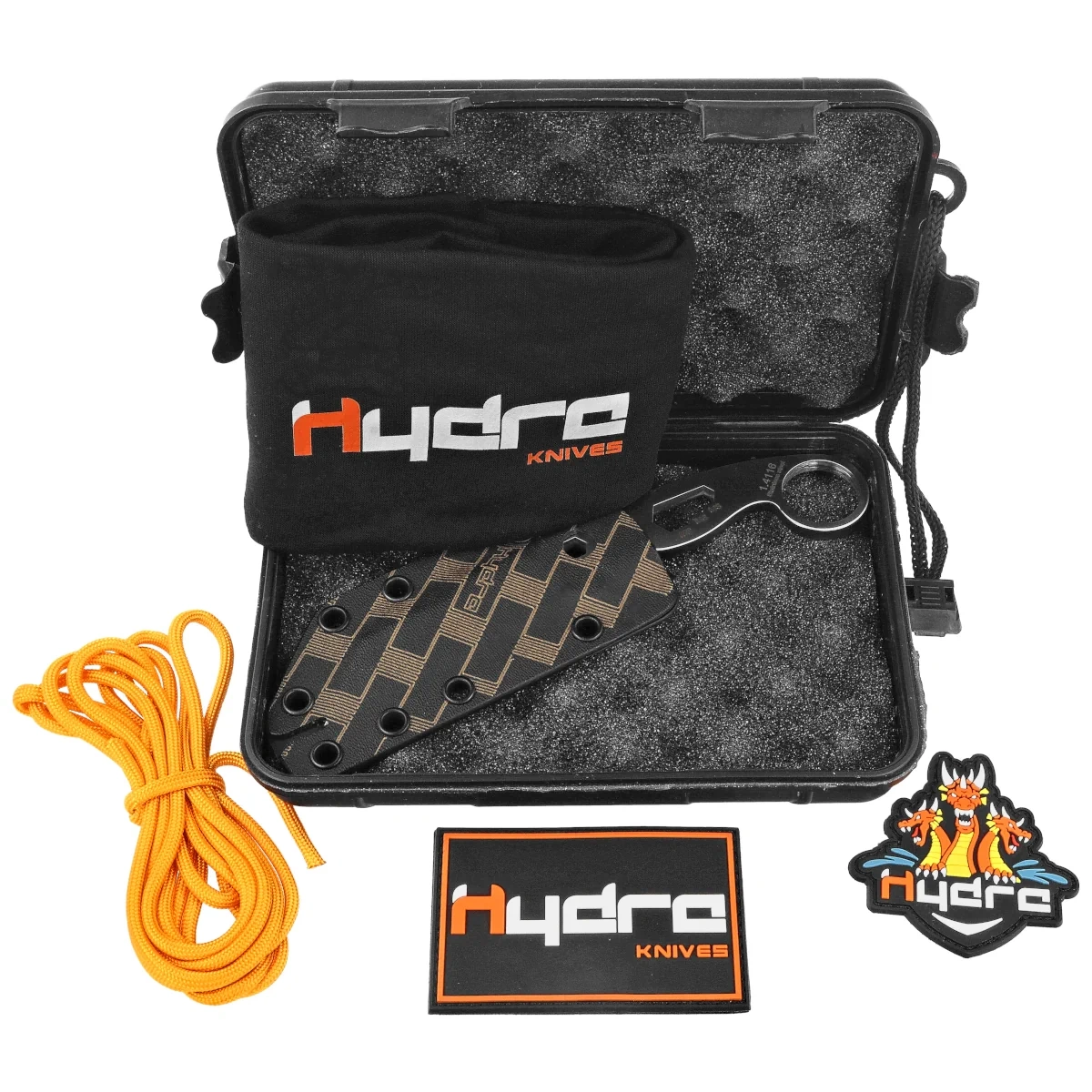 Futerał – w zestawie znajduje się czarna pochwa z Kydexu®, umożliwiająca bezpieczne przechowywanie i transport noża. Dzięki dołączonemu paracordowi, nóż można nosić na szyi, a futerał jest w pełni konfigurowalny dla użytkowników prawo- i leworęcznych, umożliwiając mocowanie na pasku, plecaku czy jako nóż na szyję.
