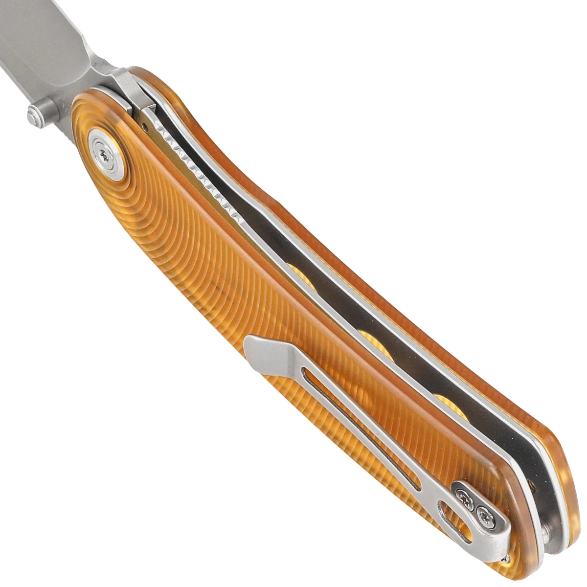 Rękojeść - okładziny z przezroczystego tworzywa Ultem™, teksturowane dla poprawienia pewności uchwytu, przykręcono do stalowej ramy noża. Otwarta konstrukcja tzw. open-backed bez typowego backspacera, mocowana do siebie stalowymi tulejami dystansowymi ułatwia czyszczenie. Prosta, solidna konstrukcja daje pewność wieloletniego użytkowania. Pivot ozdobiony stylizowanym logo producenta. Dwupozycyjny (prawa/lewa) stalowy klips deep carry pozwala przenosić dyskretnie nóż w kieszeni w pozycji tip-up (czubkiem ostrza do góry). Nad klipsem lanyard hole, otwór do przewleczenia linki zabezpieczającej lub ozdobnej.