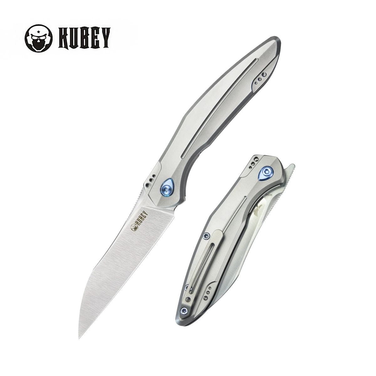 Rękojeść - to dwa kawałki litego tytanu 6AL4V o lekko szorstkiej fakturze. Fazowane krawędzie okładek eliminują ostre ranty dla wygody i poprawiają pewność uchwytu. Masywny tytanowy backspacer do którego przymocowano okładziny gwarantuje sztywność i wytrzymałość całej konstrukcji. Prosta, solidna konstrukcja daje pewność wieloletniego użytkowania. Głębokie podcięcie na palec (fore finger groove) poprawia pewność uchwytu. Oś pivota zdobi stylizowane logo marki Kubey Knife. Jednopozycyjny (prawa) tytanowy klips deep carry pozwala przenosić dyskretnie nóż w kieszeni w pozycji tip-up (czubkiem ostrza do góry). Ukryte zagłębienie w backspacerze pozwala na przewleczenia linki zabezpieczającej lub ozdobnej.
