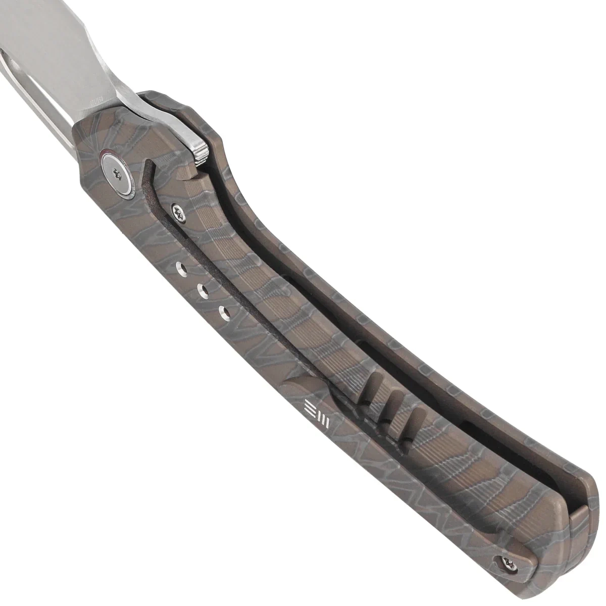 Rękojeść - to grube kawałki tytanu 6AL4V, pięknie frezowane przy pomocy obrabiarek CNC i barwione termicznie we wzór tygrysich pasków. Otwory dodające wizualnej lekkości zostały perfekcyjnie rozmieszczone wzdłuż rękojeści. Tylko nieliczne firmy są w stanie wykonać rękojeść z tak nieprawdopodobną dokładnością! Tytanowy backspacer do którego przymocowano okładziny gwarantuje sztywność i wytrzymałość całej konstrukcji. Prostota i solidność konstrukcji dają pewność wieloletniego użytkowania. Klips jednopozycyjny (prawa), wykonany z tytanu, umożliwia przenoszenie noża w pozycji tip-up. Oś pivota ozdobiona szarą obręczą (pivot collar cap). W ukrytym wgłębieniu backspacera znajdziemy miejsce do przewleczenia linki zabezpieczającej lub ozdobnej.