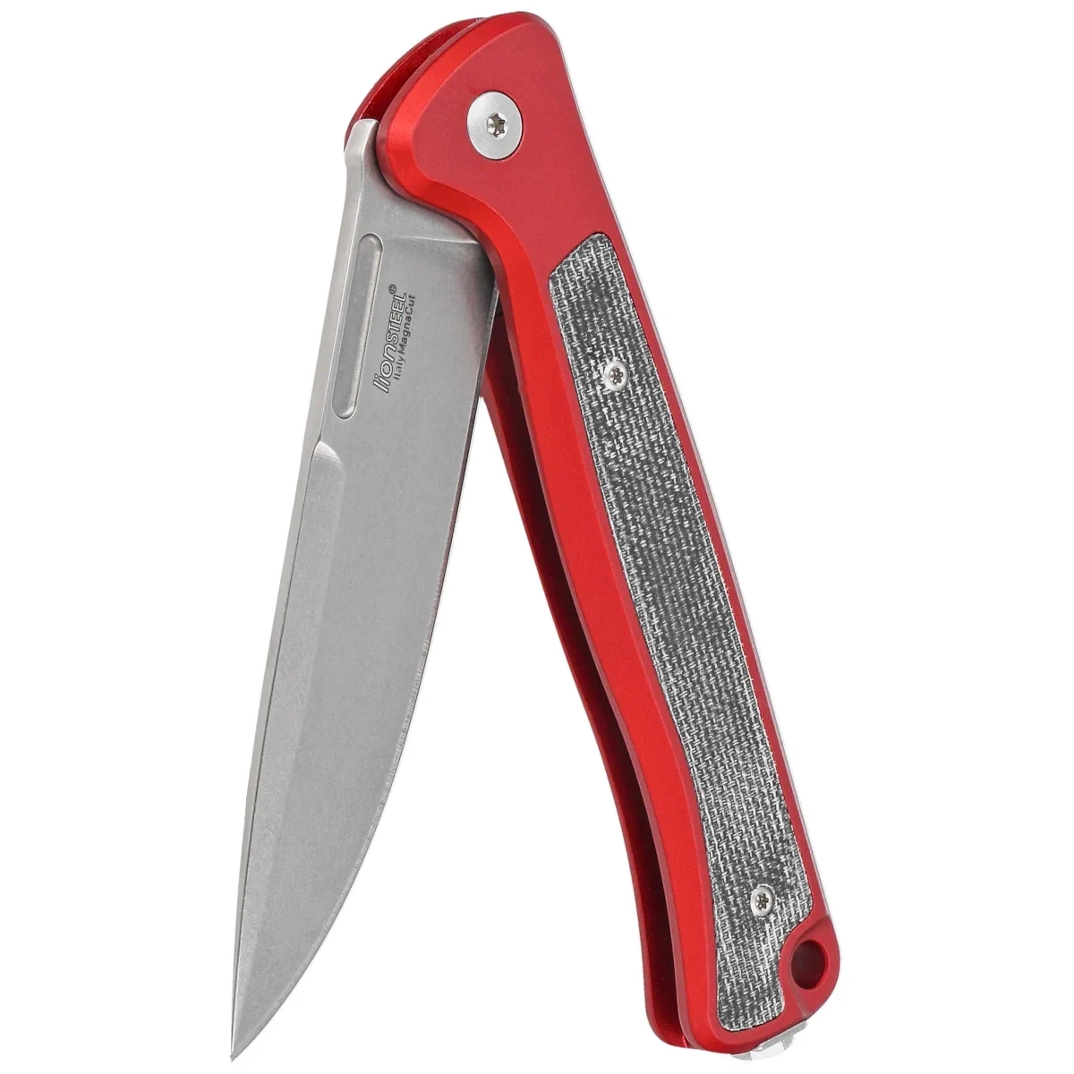 • Skinny Red Aluminium/Black Canvas Micarta, Stonewashed folder włoskiej manufaktury LionSteel projektu Michele "Mollletta" Pensato z technologią Solid i klingą ze stali MagnaCut. Zdobywca nagrody "Imported Knife of The Year 2024" na targach Blade Show.