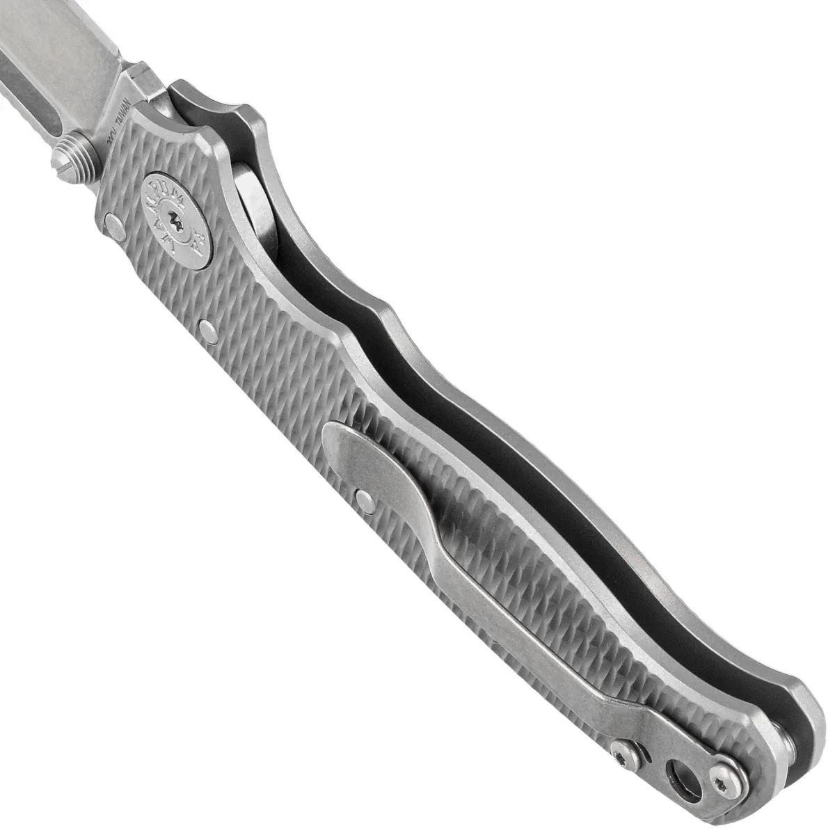 Rękojeść - wykonana z tytanu 6AL4V o lekko szorstkiej fakturze i wykonanym na obrabiarkach CNC wzorze na rękojeści. Fazowane krawędzie okładek eliminują ostre krawędzie dla wygody, a wykonane z przodu podcięcie na palec (fore finger groove) poprawia pewność uchwytu. Jednopozycyjny, prawostronny klips umożliwia przenoszenie noża w pozycji tip-up, czubkiem ostrza ku górze. W zestawie dodawany jest klips dla leworęcznych.