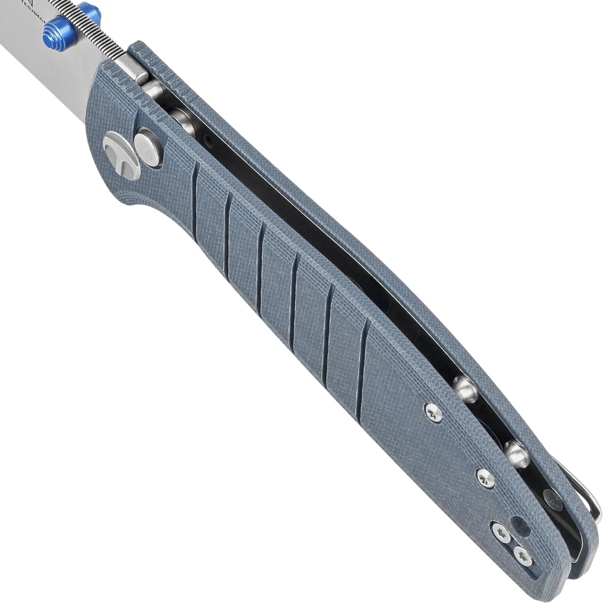 Głownia - typu Drop Point o długiej krawędzi tnącej, wykończona eleganckim satynowaniem. Niewielka grubość klingi w połączeniu z wysokim, płaskim szlifem daje doskonałą geometrię krawędzi tnącej oraz ekstremalną wydajność cięcia. Ceramiczne łożyska kulkowe wspomagają płynną pracę mechanizmu otwierającego klingę, którą można otworzyć za pomocą obustronnego kołka w klindze (dual thumb stud). Kołek został anodyzowany na niebiesko co daje ładny kontrast z kolorem klingi. Na grzbiecie klingi upper jimping, karbowane oparcie pod kciuk. Całość blokowana jest solidną blokadą button lock.