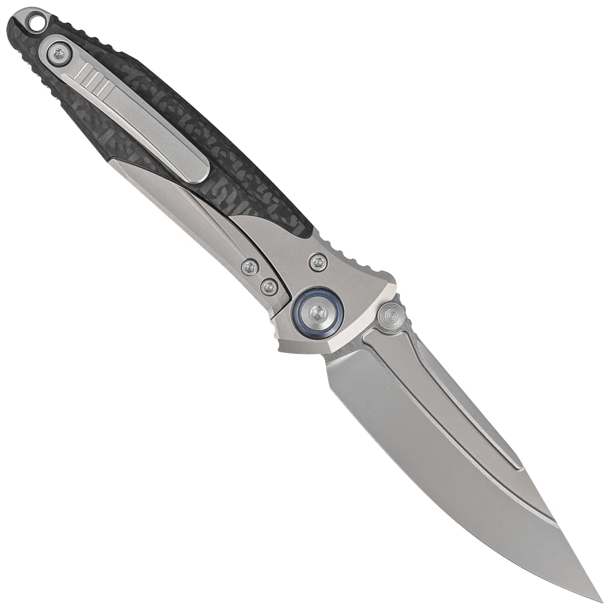Rękojeść - wykonana z doskonałą precyzją w technologii 3D na frezarkach CNC z tytanu. Perfekcyjnie spasowane wkładki (inlay) z kompozytu Carbon Fiber powodują, że nóż nie ślizga się w dłoni podczas używania. Na grzbiecie rękojeści znajdują się nacięcia (jimping) dla pewniejszego chwytu. Ergonomiczny profil oraz frezowany jednopozycyjny (prawa) masywny klips, umożliwiają dyskretne przenoszenie noża w kieszeni, w pozycji tip-up(czubkiem ostrza do góry). Oś pivota ozdobiona niebieską obręczą (pivot collar cap). W tylnej części znajduje się lanyard hole, miejsce na linkę zabezpieczająca lub ozdobną. Wystający fragment tytanowego szkieletu może służyć jako improwizowany zbijak do szyb.