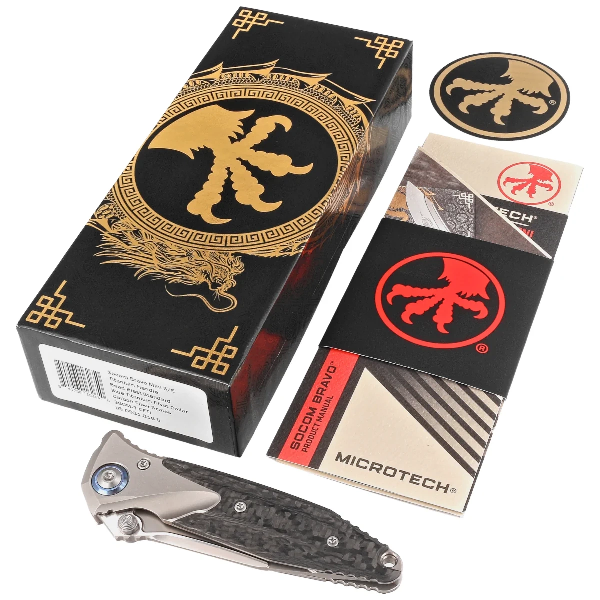 Nóż składany Microtech Socom Bravo Mini S/E Titanium/Carbon Fiber, Blue HW, Bead Blasted M390 by Tony Marfione (260M-7CFTI)