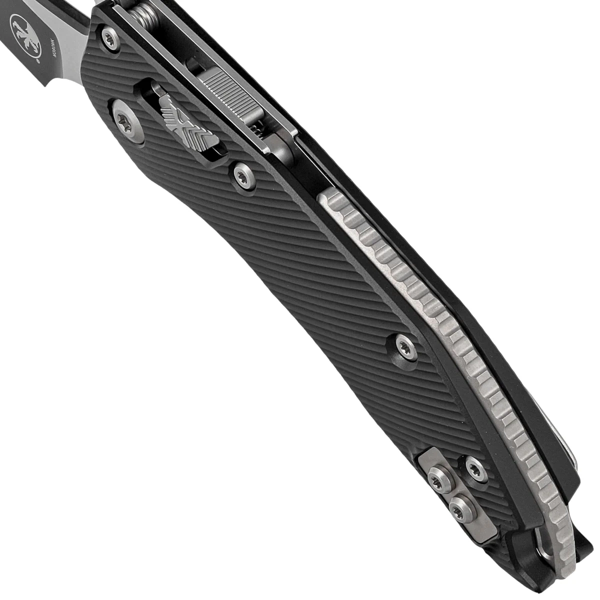 Rękojeść - wykonana na frezarkach CNC z najwyższą precyzją, z aluminium 6061-T6, z głęboko frezowaną, trójwymiarową strukturą 3D Fluted. Szeroki suwak blokady z charakterystyczną dla firmy Microtech schodkową strukturą (X Button) zapewnia pewną i komfortową obsługę. Okładziny połączono solidnym, aluminiowym backspacerem. Dwustronny (prawa / lewa) klips umożliwia na dyskretne przenoszenie noża w pozycji tip-up. Wystający fragment backspacera z otworem na linkę, może również służyć za improwizowany zbijak do bicia szkła.