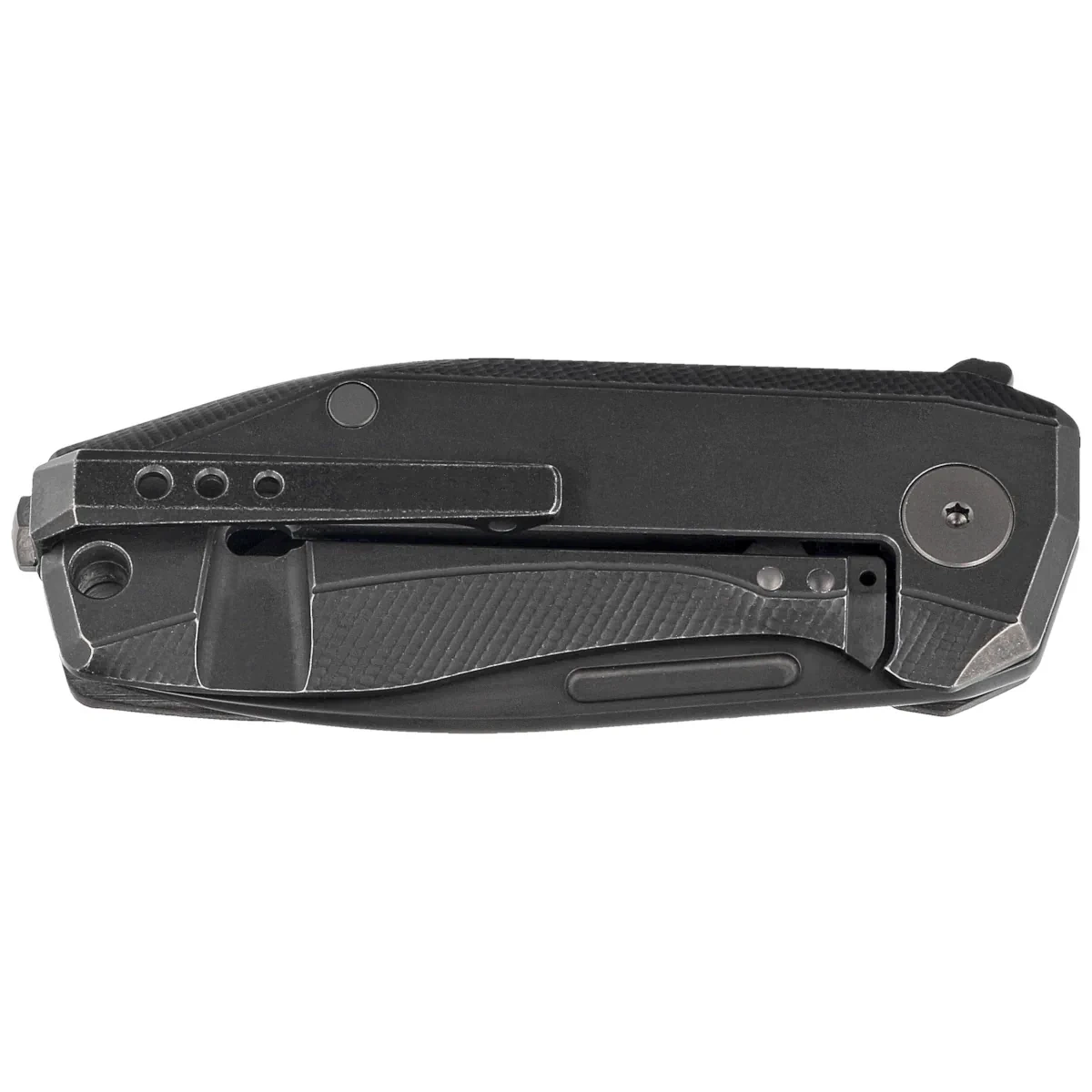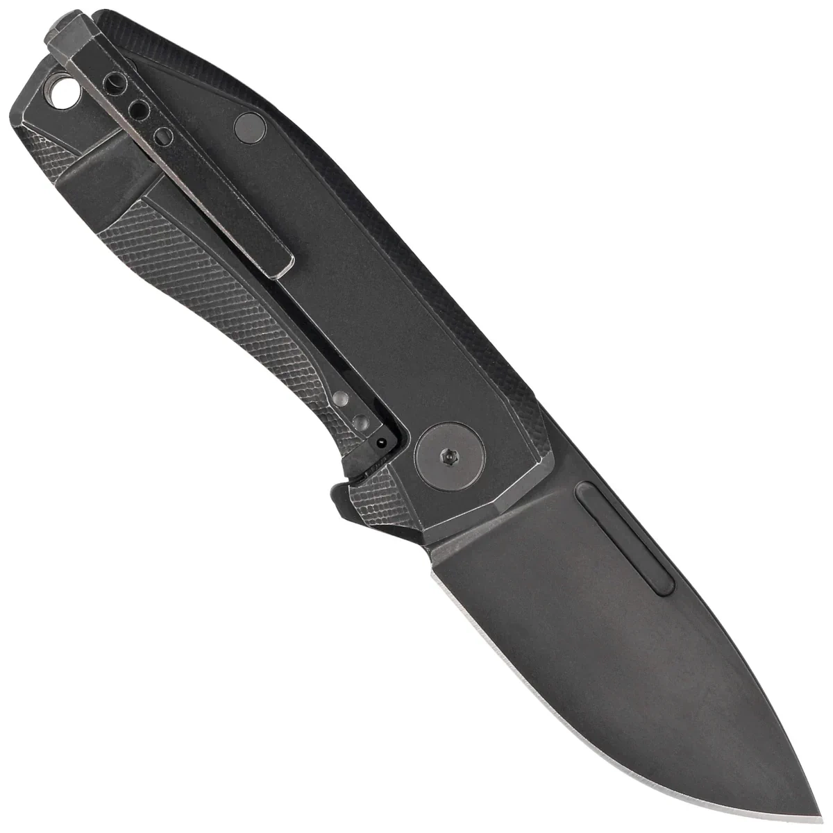 Rękojeść - strona prezentacyjna wykonana z Purple Haze Fat Carbon, strona blokady z litego tytanu 6AI4V., okładziny przykręcono do frezowanego obrabiarkami CNC tytanowego backspacera, co zapewnia pożądaną sztywnośc i wytrzymałość całej konstrukcji. Fazowanie okładek eliminuje ostre krawędzie dla wygody, a wykonane z przodu podcięcie na palec (fore finger groove) poprawia pewność uchwytu. Dwupozycyjny (prawa/lewa) tytanowy głęboki klips pozwala przenosić dyskretnie nóż w pozycji tip-up (czubkiem do góry). Pod klipsem, lanyard hole, otwór na linkę zabezpieczającą lub ozdobną.
