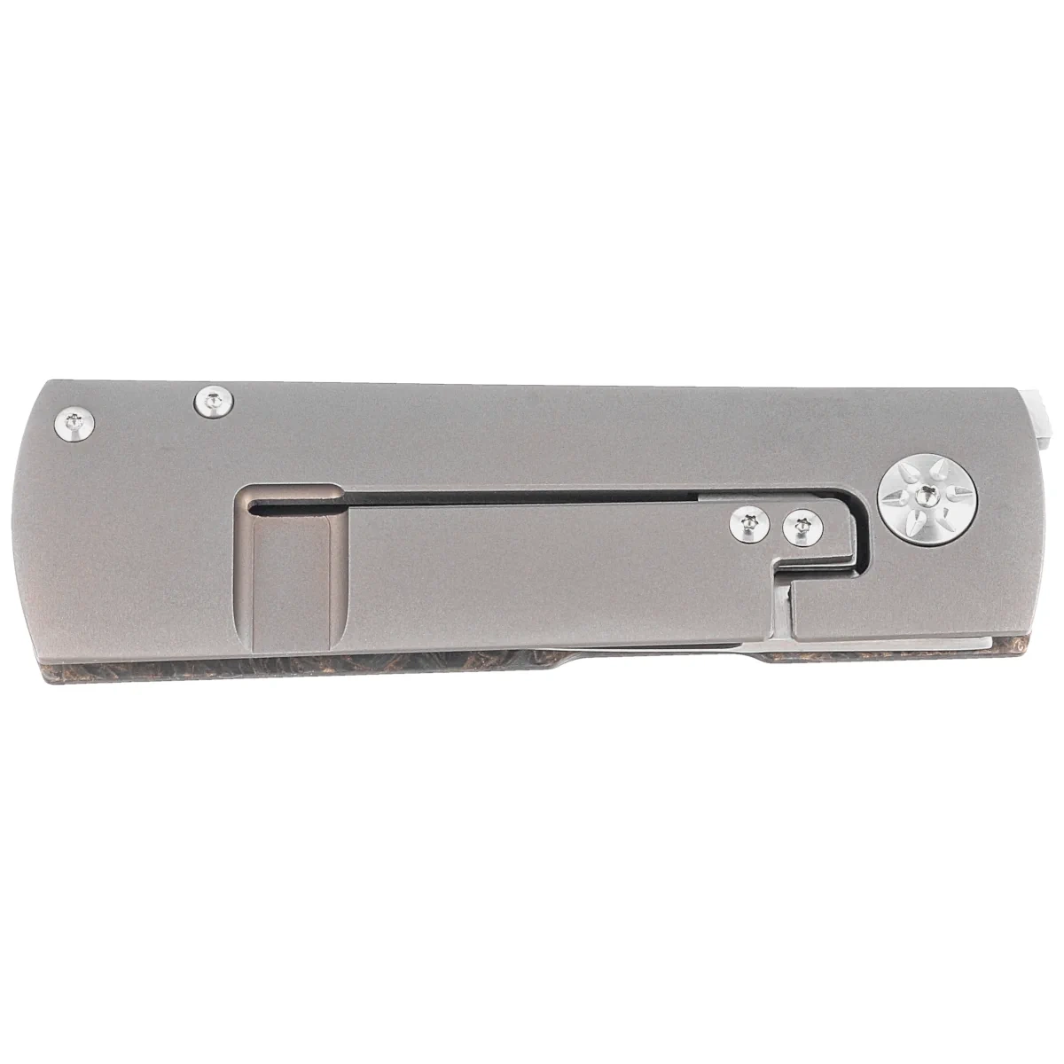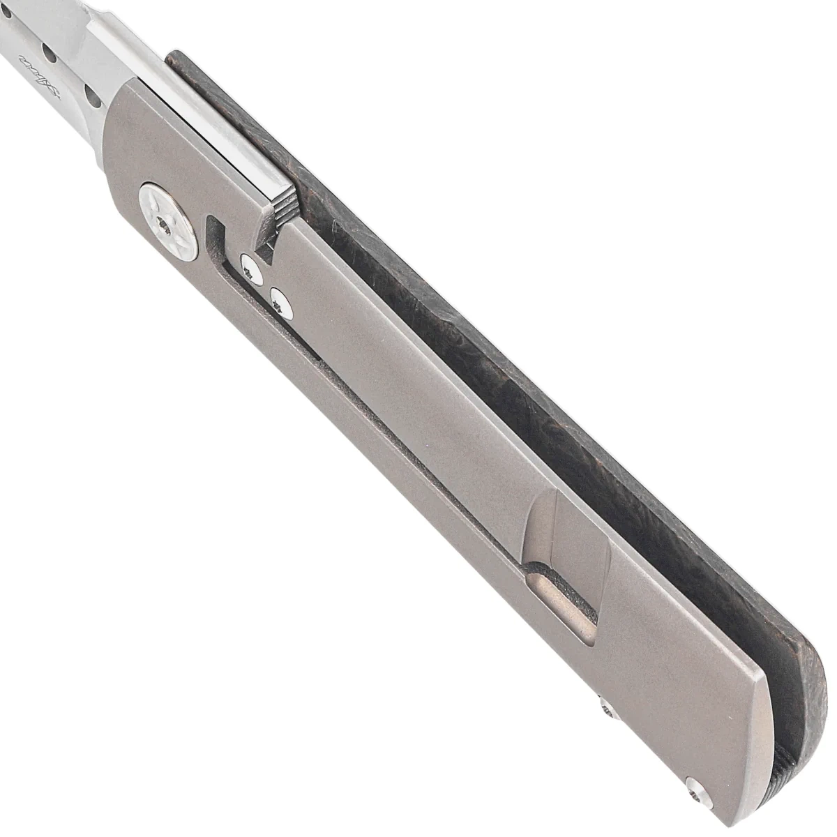 Rękojeść - okładzina po stronie prezentacyjnej z kompozytu Fat Carbon, materiału o wyjątkowej wytrzymałości i estetyce. Strona blokady z tytanu, okładziny mocowane do kunsztownego backspacera. Ozdobny pivot pięknie kontrastuje z kolorem okładzin. Prosta linia okładzin pozwala na dopasowanie rękojeści niemal do każdej dłoni, niezależnie od jej rozmiaru czy preferencji chwytu.