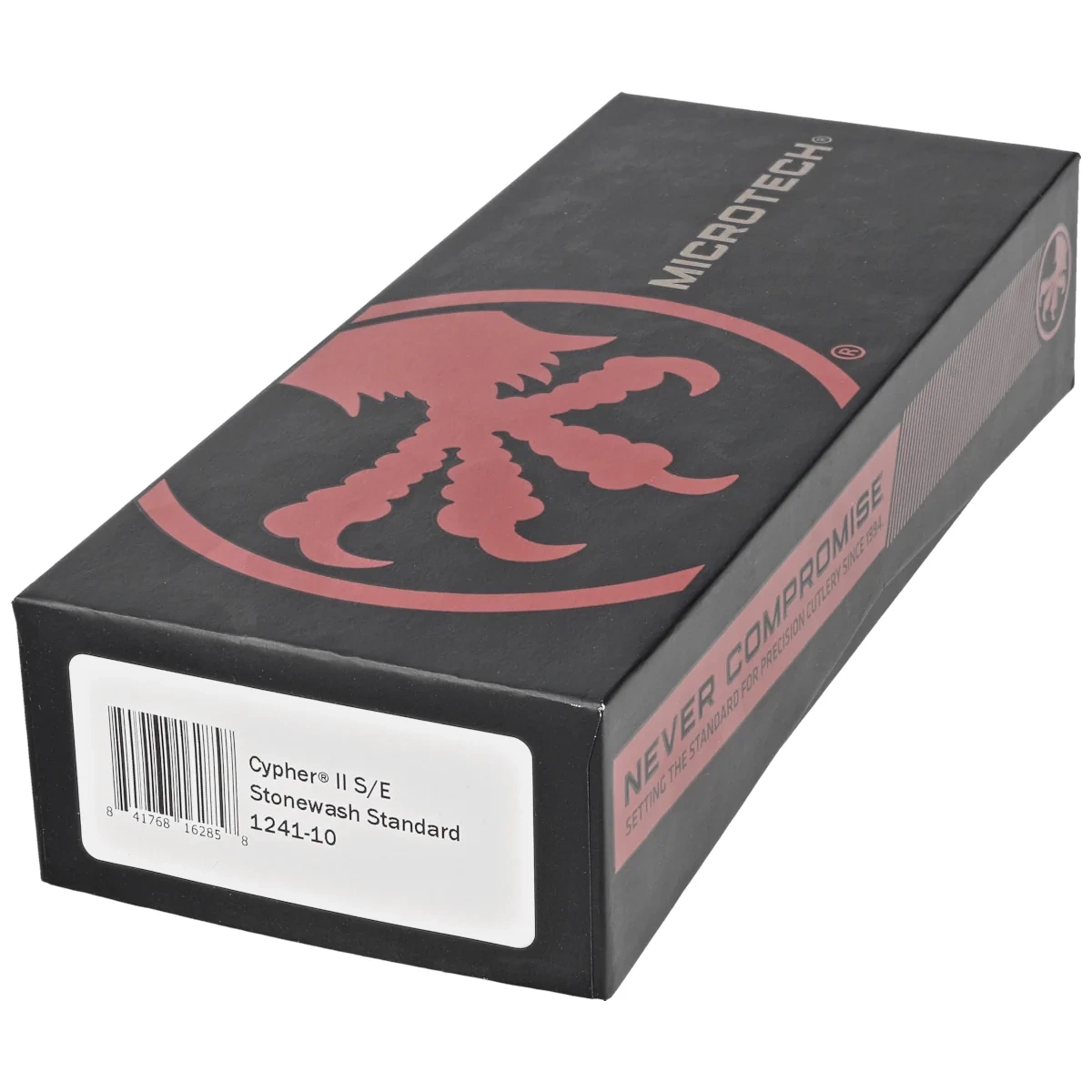Cypher II S/E Black Aluminium, Stonewashed to druga generacja legendarnego OTF (Out The Front) stworzonego we współpracy Anthony'ego Marfione i Deryka Monroe. Reprezentujący szczyt zaawansowanej technologii Cypher, przeszedł kompleksową modernizację. Innowacyjny podwójny mechanizm napędzający ostrze zapewnia płynniejszą pracę niż kiedykolwiek wcześniej w nożach OTF.