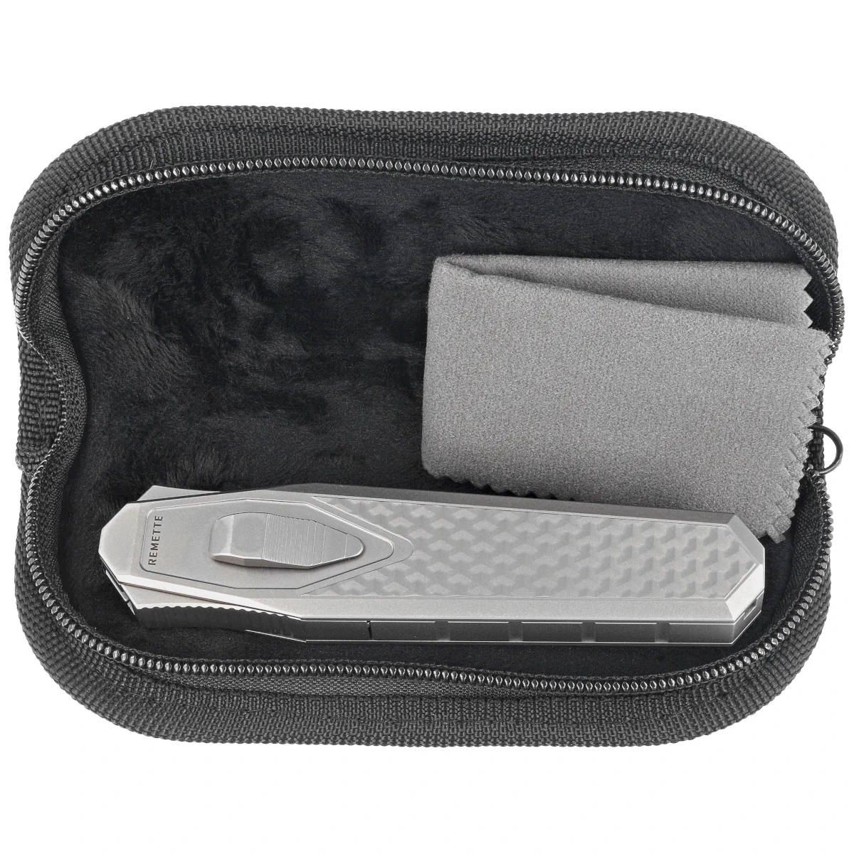 Swordfish Titanium / Red Blue Carbon Fiber, Pearlescent otwierany intuicyjne, nóż składany z wchodzącej na rynek manufaktury Remette Knives, popis inżynierów w projektowaniu. Gravity OTF (Out The Front) głownia wysuwana z przodu dzięki sile grawitacji. Wzorowany na konstrukcji grawitacyjnego noża lotniczego Luftwaffe, potocznie nazywanego nożem niemieckich spadochroniarzy. Intuicyjne wysuwanie / wsuwanie ostrza jedną ręką (pod wpływem siły ciężkości) oraz najlepsze materiały takie jak stal głowni Böhler M390 czy tytanowa rękojeść, perfekcyjnie połączone ze sobą z niezrównaną jakością marki Remette!
