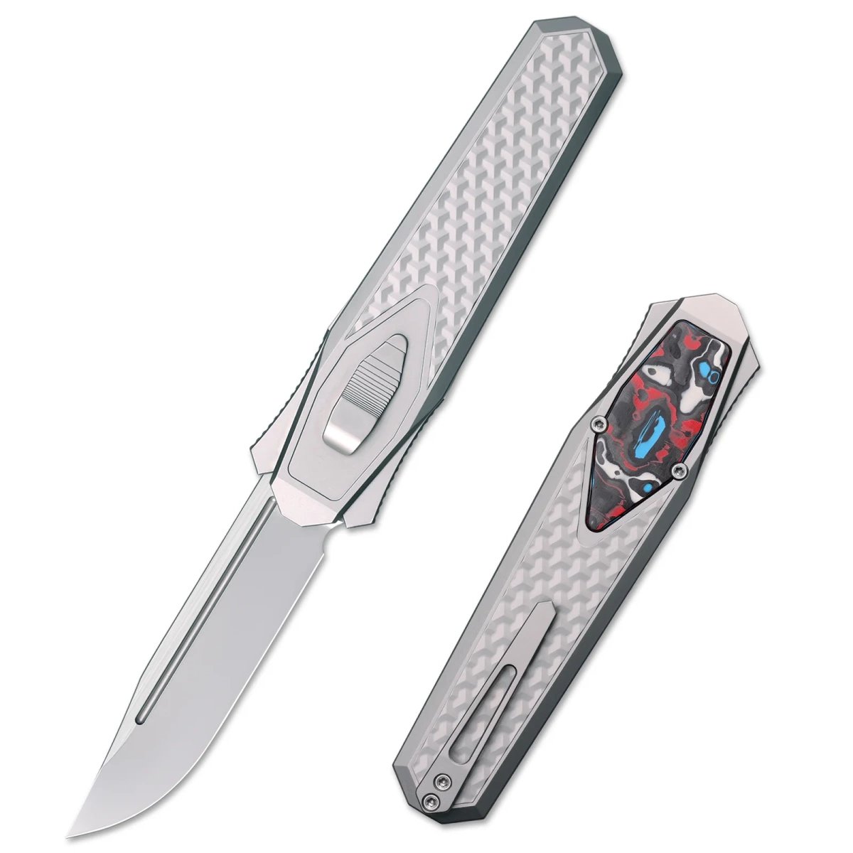- Swordfish Titanium / Red Blue Carbon Fiber, Pearlescent. Innowacyjny nóż z młodej manufaktury Remette Knives. OTF z wysuwanym dzięki sile grawitacji ostrzem ze stali Böhler M390. Rękojeść z tytanu z nowatorskim systemem uwalniania ostrza za pomocą suwaka