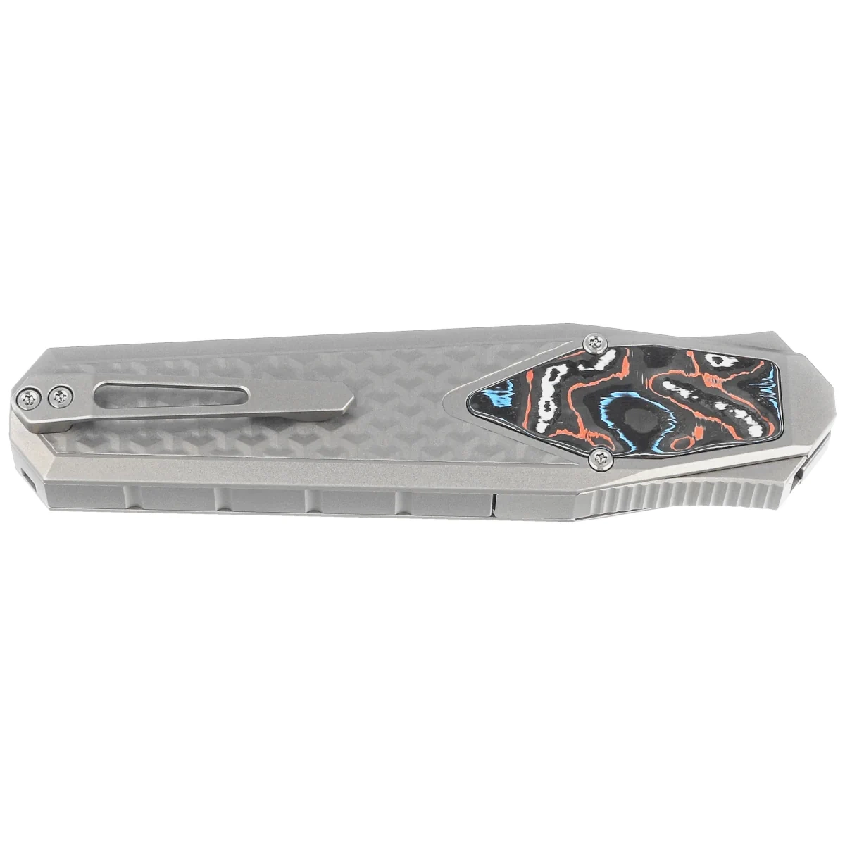 Rękojeść - wykonana na frezarkach CNC z tytanu, z trójwymiarową teksturą. Fazowane krawędzie okładek eliminują ostre ranty, a perfekcyjnie dopasowana wkładka (inlay) z czerwono niebieskiego kompozytu Carbon Fiber nadają ekskluzywnego charakteru oraz poprawiają pewność uchwytu. Po prawej stronie kunsztowny suwak do wysuwania/wsuwania klingi. Jednopozycyjny tytanowy (prawa) klips deep carry umożliwia dyskretne przenoszenie noża w kieszeni w pozycji tip-down (czubkiem ostrza do dołu).