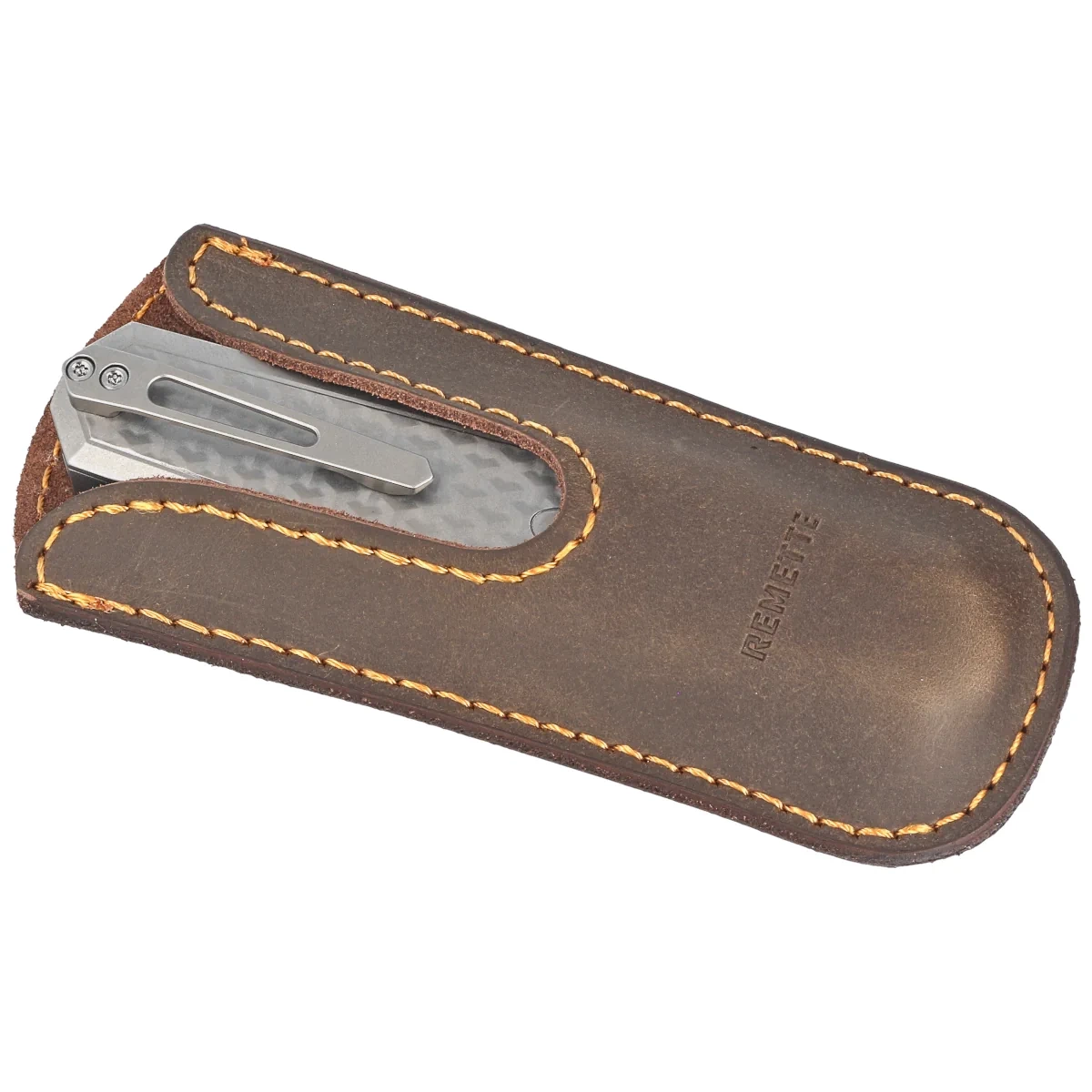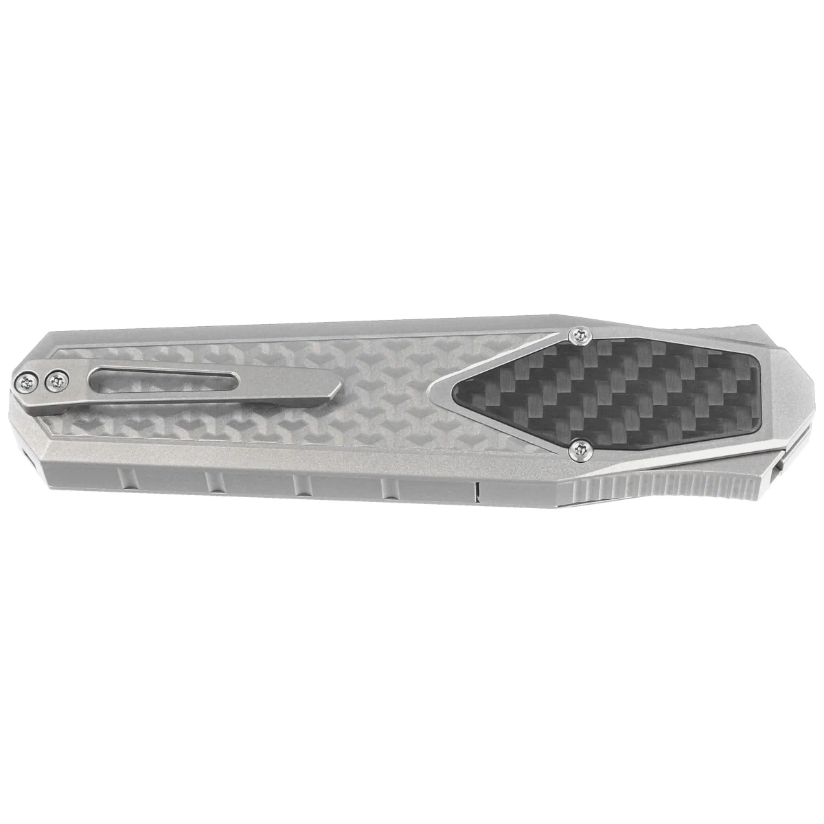 Rękojeść - wykonana na frezarkach CNC z tytanu, z trójwymiarową teksturą. Fazowane krawędzie okładek eliminują ostre ranty, a perfekcyjnie dopasowana wkładka (inlay) z kompozytu Carbon Fiber nadają ekskluzywnego charakteru oraz poprawiają pewność uchwytu. Po prawej stronie kunsztowny suwak do wysuwania/wsuwania klingi. Jednopozycyjny tytanowy (prawa) klips deep carry umożliwia dyskretne przenoszenie noża w kieszeni w pozycji tip-down (czubkiem ostrza do dołu).