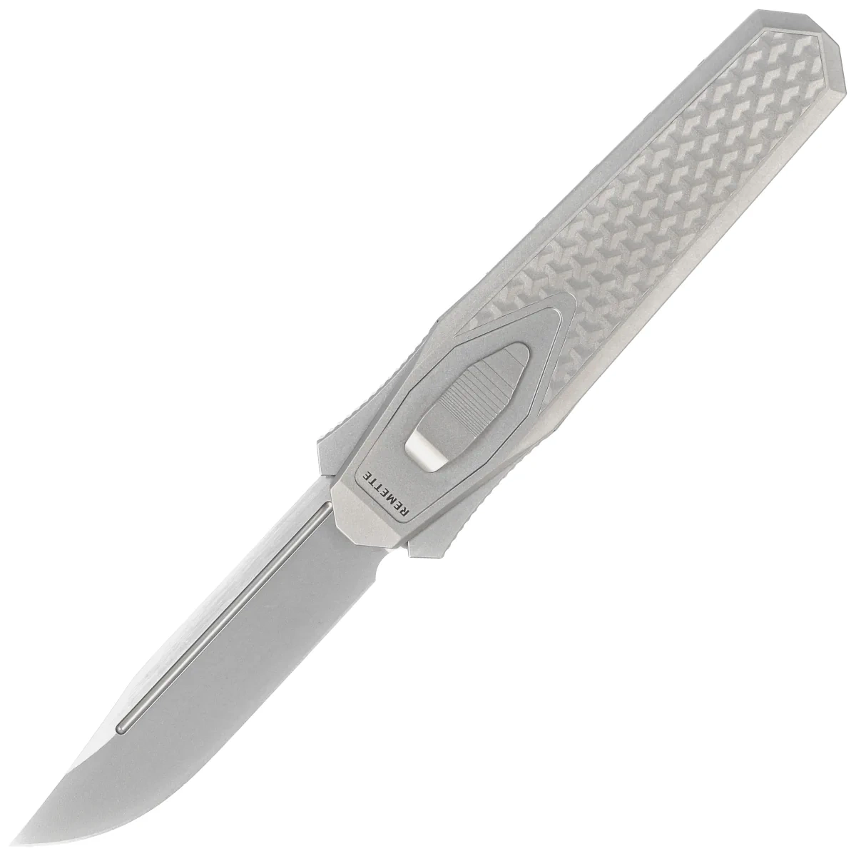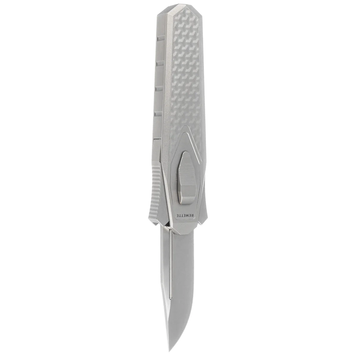 • Swordfish Titanium / Carbon Fiber, Pearlescent. Innowacyjny nóż z młodej manufaktury Remette Knives. OTF z wysuwanym dzięki sile grawitacji ostrzem ze stali Böhler M390. Rękojeść z tytanu z nowatorskim systemem uwalniania ostrza za pomocą suwaka