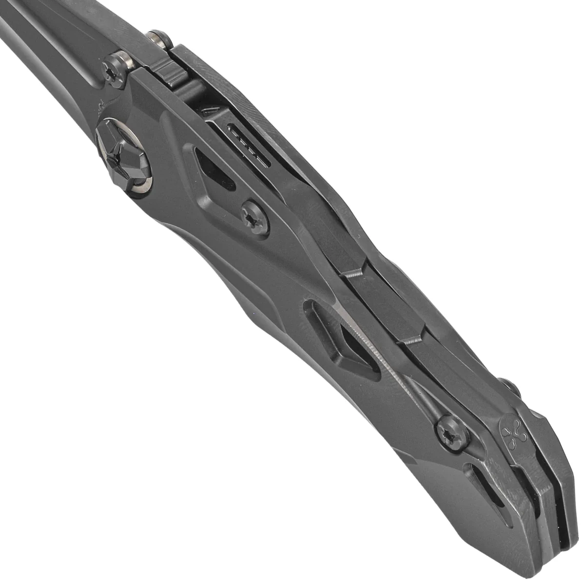 Głownia - typu harpoon, pokryta czarną powłoką DLC. Długa krawędź tnąca, zbiega się w kierunku ostrego jak igła czubka szerokiej klingi. Grubość ostrza i zbrocze zapewniają wysoką wytrzymałość. Zastosowano tu szlif mieszany, w tylnej części jest to wklęsły szlif do cięcia i prac precyzyjnych tzw Hollow Ground Primary Bevel. W przedniej części mamy wysoki, płaski szlif wzmacniający czubek Flat Ground. Nóż możemy otworzyć przy użyciu płetwy front flippera lub podłużnego otworu w klindze (Thumb Hole). Całość blokowana jest nowoczesną blokadą Frame Lock ze stalową wkładką zapobiegającą wycieraniu się czoła blokady.