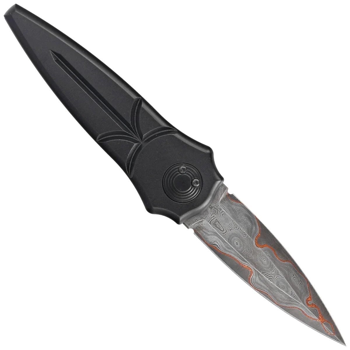 Głownia - typu Dagger, obustronnie ostrzona (Double Edge), trawiona kwasem dla podkreślenia wzorów damastu. Gładkie ostrze Plain wyprowadzono szlifem płaskim, który zapewnia wytrzymałość, doskonałą geometrię krawędzi tnącej oraz ekstremalną wydajność cięcia. Płynne i gładkie otwieranie grawitacyjne, blokada typu clamshell.