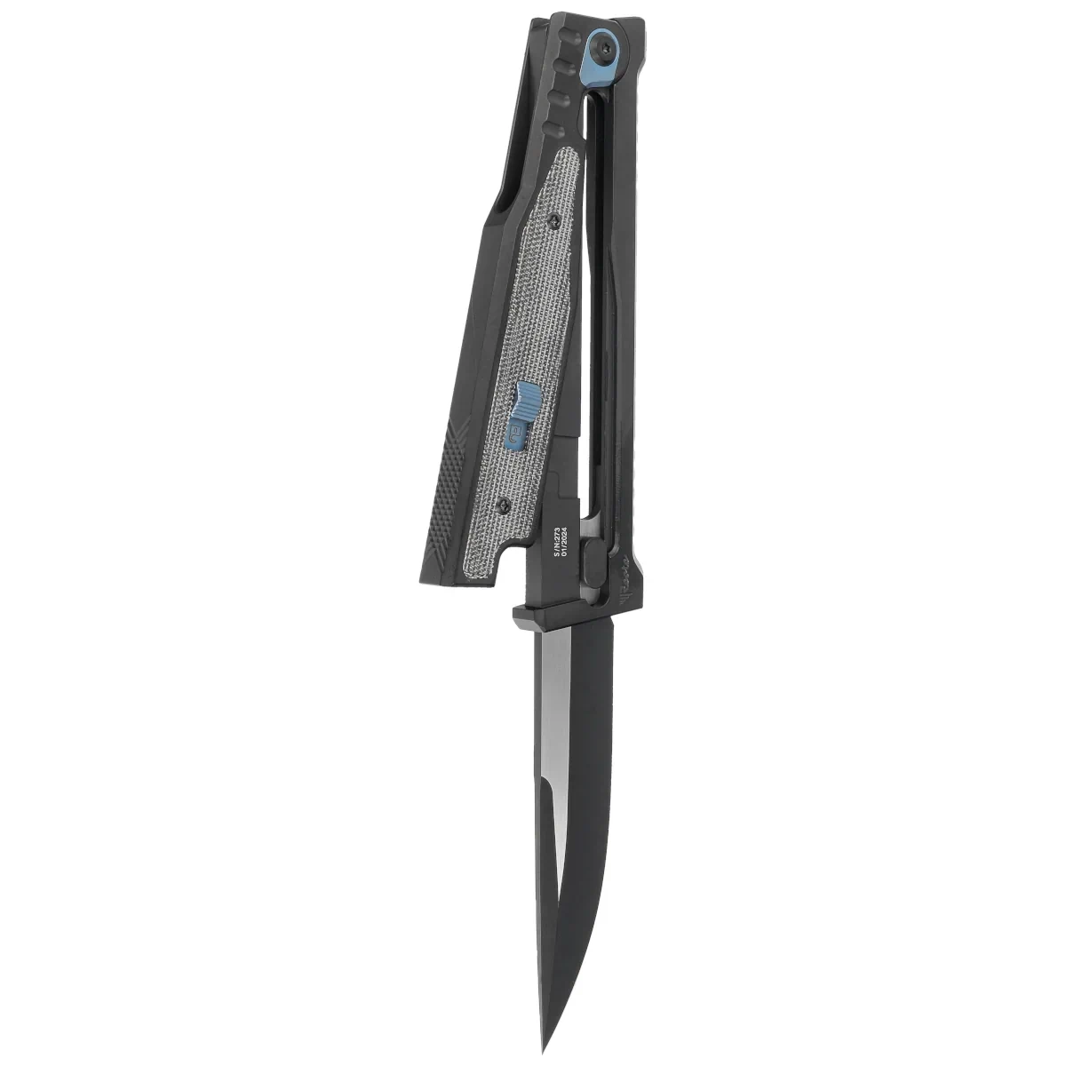 Głownia - typu Drop Point. Pokryta czarną powłoką PVD. Brzusiec wydłuża długość krawędzi tnącej w stosunku do długości smukłej klingi zbiegając się w kierunku ostrego jak igła czubka noża. Grubość klingi zapewnia wysoką wytrzymałość podczas gdy wysoki, płaski szlif daje doskonałą geometrię krawędzi tnącej oraz ekstremalną wydajność cięcia. Blokowanie mechaniczne poprzez zatrzaśnięcie fragmentu rękojeści na owalnym kołku blokady.
