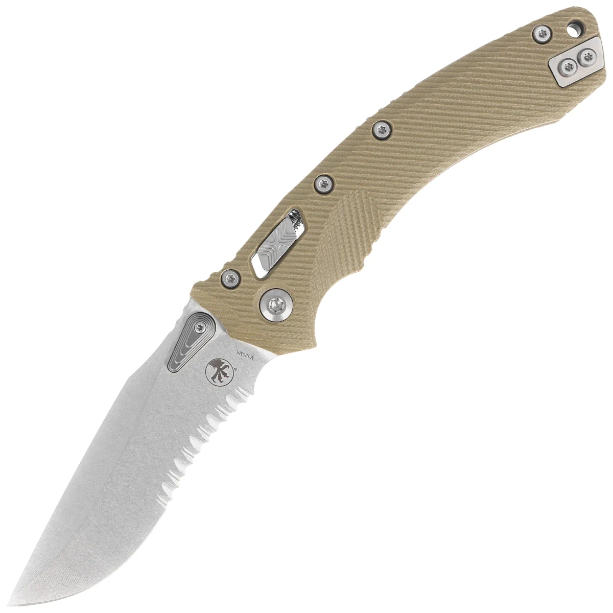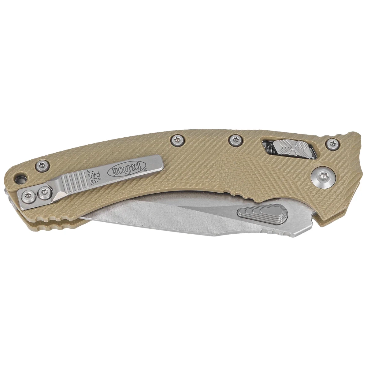 Rękojeść - wykonana z wytrzymałego kompozytu G10, dla lepszego uchwytu pokryta wyfrezowanymi liniami (Fluted). Szeroki suwak blokady z charakterystyczną dla firmy Microtech schodkową strukturą X. Obie okładziny zostały skręcone przy pomocy solidnego, backspacera. Dwustronny (prawa / lewa) tytanowy klips pozwala dyskretnie nosić nóż w pozycji tip-up. Nad klipsem lanyard hole, miejsce na linkę zabezpieczającą lub ozdobną.