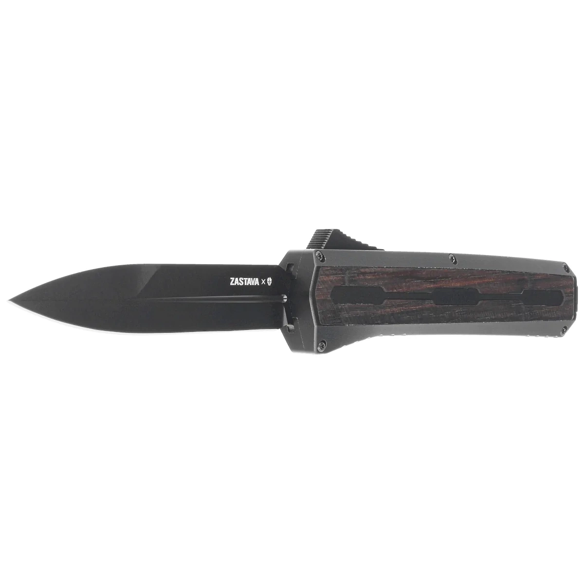 • A7 Zastava S/P Black Aluminium/Tactical Black Wood, Black taktyczny nóż OTF wykonany we współpracy z Zastava Arms czerpie inspirację z kultowego karabinu Zastava M70. Rękojeść z aluminium i drewna. Ostrze stal S35VN pokryta czarną powłoką na bazie tytanu.