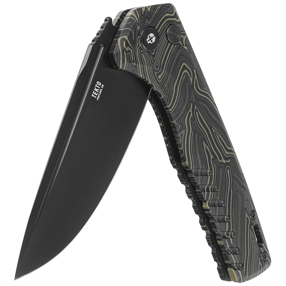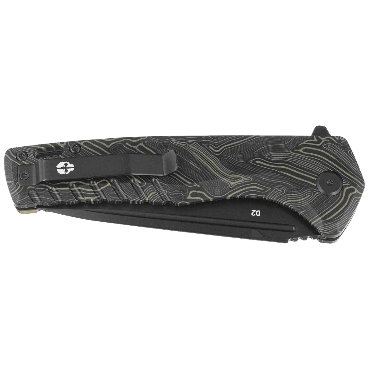 Rękojeść - wykonana z doskonałą precyzją z kompozytu Damascus G10, praktycznie niezniszczalnego tworzywa, niewrażliwego na warunki atmosferyczne, odpornego na chemikalia i uszkodzenia mechaniczne. Faktura powierzchni oraz jimping na grzbiecie i dole rękojeści powodują, że nóż nie ślizga się w dłoni podczas używania. Otwarta konstrukcja tzw. open-backed bez typowego backspacera, mocowana do siebie stalowymi tulejami dystansowymi ułatwia czyszczenie. Prosta, solidna konstrukcja daje pewność wieloletniego użytkowania. Ergonomiczny profil oraz jednopozycyjny (prawa/) klips, umożliwiają dyskretne przenoszenie noża w kieszeni, w pozycji tip-up (czubkiem ostrza do góry). Nad klipsem znajduje się lanyard hole, miejsce na linkę zabezpieczająca lub ozdobną.