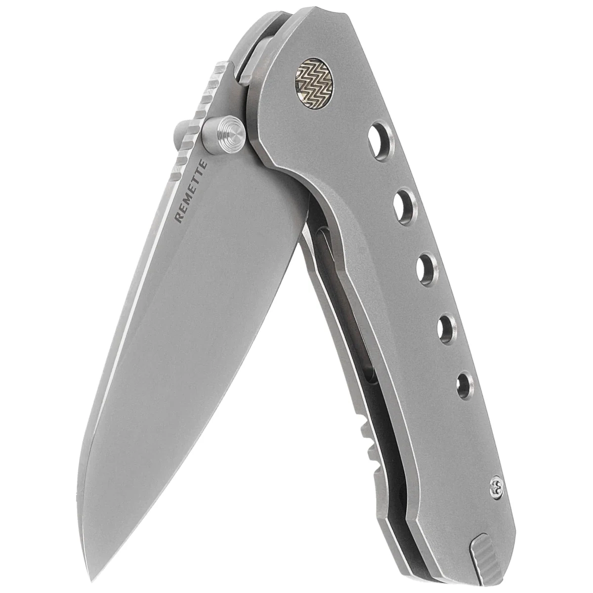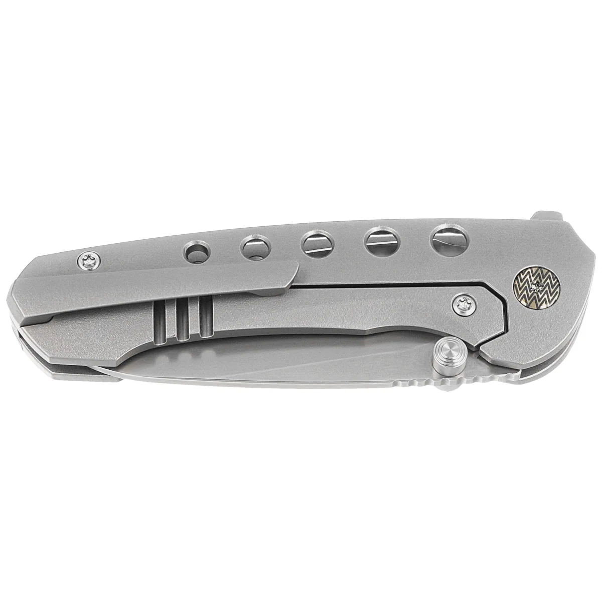 Rękojeść - grube kawałki piaskowanego tytanu 6AL4V, pięknie frezowane przy pomocy obrabiarek CNC. Tytanowy backspacer do którego przymocowano okładziny gwarantuje sztywność i wytrzymałość całej konstrukcji. Prostota i solidność konstrukcji dają pewność wieloletniego użytkowania. Klips jednopozycyjny (prawa), wykonany z tytanu, umożliwia przenoszenie noża w pozycji tip-up. Oś pivota ozdobiono wykonaną z tytanu nakładką. W tylnej części rękojeści miejsce do przechowywania tytanowej wykałaczki, prostego, ale bardzo przydatnego w codziennym życiu i wyprawach outdoorowych akcesorium.
