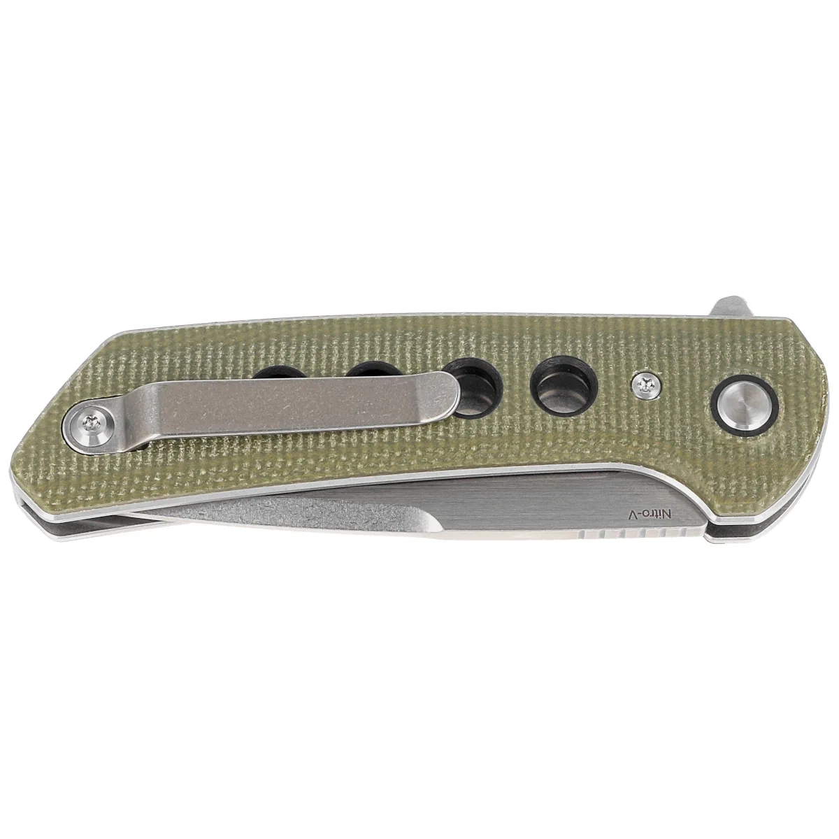 Rękojeść - okładziny z Micarty, praktycznie niezniszczalnego tworzywa niewrażliwego na warunki atmosferyczne, odpornego na chemikalia i uszkodzenia mechaniczne. Otwory w rękojeści inkrustowane kompozytem G10. Fazowane krawędzie okładek eliminują ostre ranty a charakterystyczne teksturowanie powierzchni poprawia pewność uchwytu. Masywny backspacer do którego przymocowano okładziny gwarantuje sztywność i wytrzymałość całej konstrukcji. Po lewej stronie suwak blokujący możliwość przypadkowego zwolnienia blokady. Dwupozycyjny (prawa/lewa) klips umożliwia przenoszenie noża w pozycji tip-up, czubkiem ostrza ku górze.