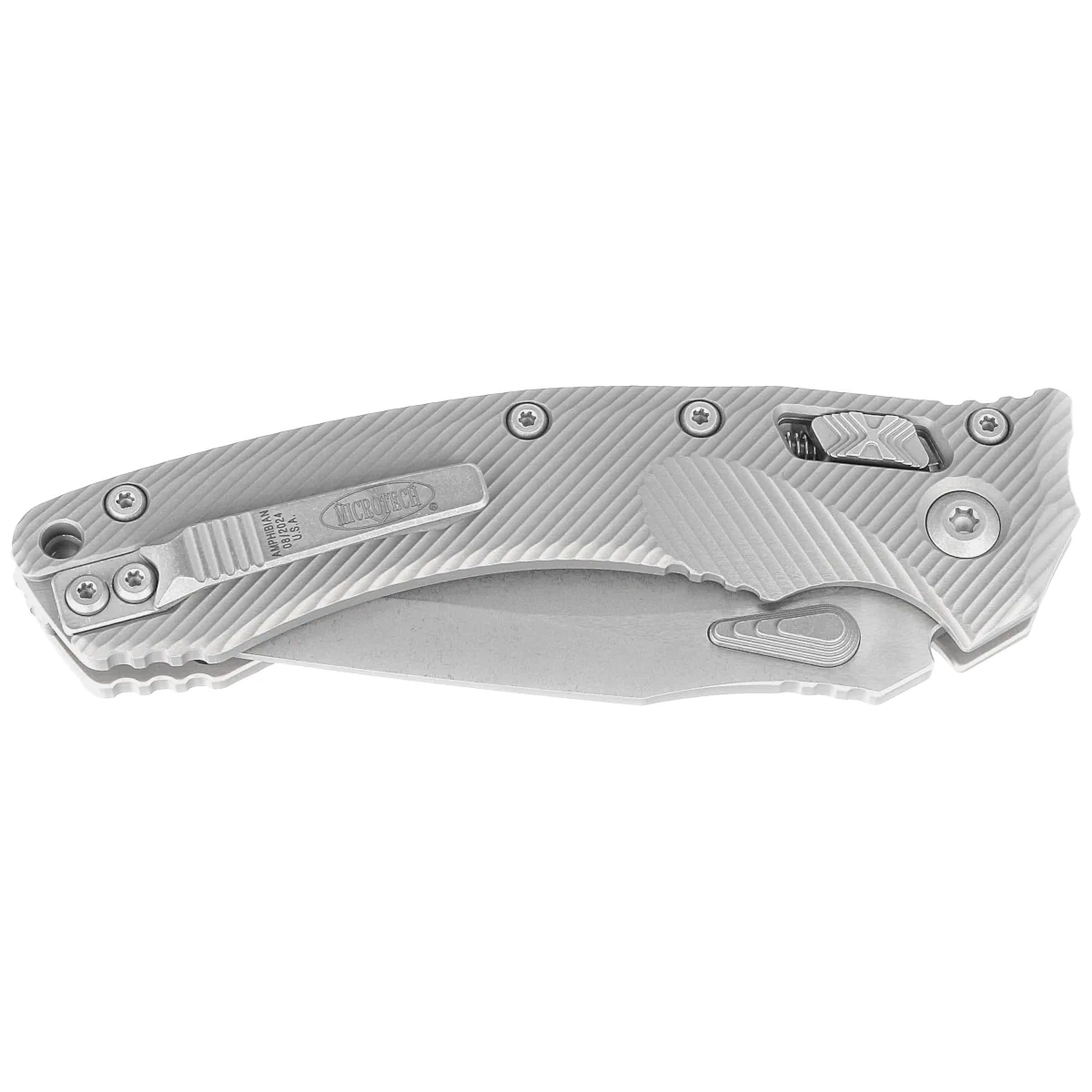 Rękojeść - wykonana z doskonałą precyzją w technologii 3D na frezarkach CNC, ze szczotkowanego i polerowanego aluminium 6061-T6, dla lepszego uchwytu pokryta wyfrezowanymi liniami (Fluted). Szeroki suwak blokady z charakterystyczną dla firmy Microtech schodkową strukturą X. Obie okładziny zostały skręcone przy pomocy solidnego, backspacera. Dwustronny (prawa / lewa) tytanowy klips pozwala dyskretnie nosić nóż w pozycji tip-up. Nad klipsem lanyard hole, miejsce na linkę zabezpieczającą lub ozdobną.
