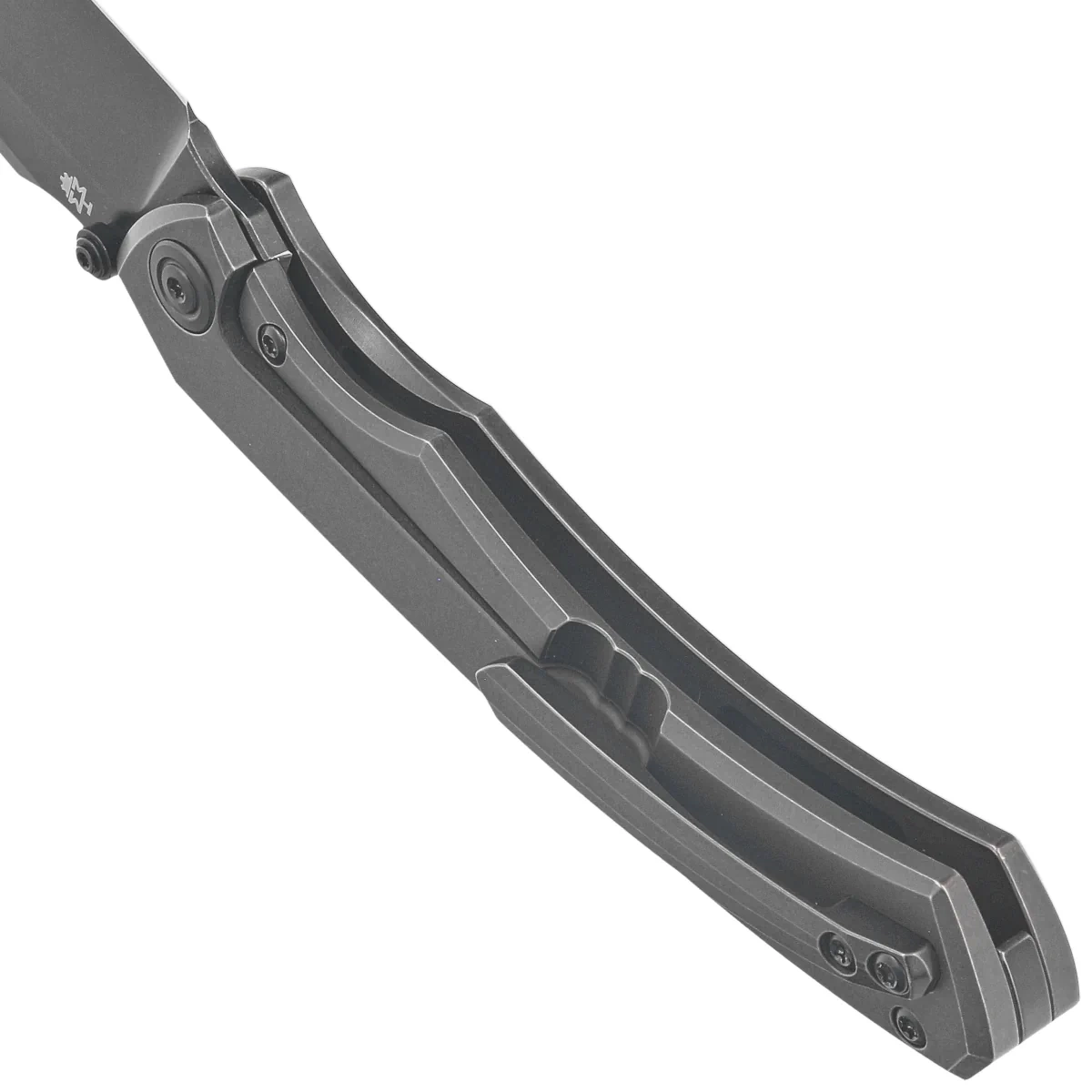 Rękojeść - to dwa kawałki litego, tytanu 6AL4V, przecieranego na krawędziach. Fazowane krawędzie okładek eliminują ostre krawędzie dla wygody, a podcięcie na palec (fore finger groove) poprawia pewność uchwytu. Tytanowy backspacer do którego przymocowano okładziny gwarantuje sztywność i wytrzymałość całej konstrukcji. Jednopozycyjny, prawostronny tytanowy klips umożliwia przenoszenie noża w pozycji tip-up, czubkiem ostrza ku górze.