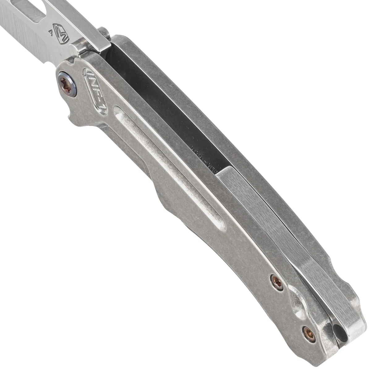 Głownia - smukła o profilu Drop Point wykończona maszynowo metodą „tumbled". Ręcznie wykonane wklęsłe szlify o średniej wysokości, zapewniają wyjątkową zdolność przebijania i krojenia z wytrzymałością czołgu. Efektowne połączenie rowka na palec (finger groove) i otworu na kciuk (thumb hole) oraz minimalistyczna płetwa front flipper sprawiają, że ostrze jest naprawdę wyjątkowe. Dla zwiększenia niewrażliwości na zanieczyszczenia zastosowano podkładki z fosforobrązu, dzięki czemu oś pivota jest bardziej odporna na pracę w terenie. Potężna, tytanowa sztaba frame locka zabezpiecza nóż przed złożeniem, rozłożony i zabezpieczony nóż jest solidny niczym kasa pancerna.