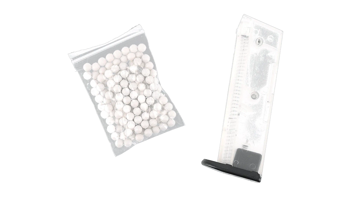 - Dwa magazynki: low-cap (14 kulek) i hi-cap (104 kulki) dla dłuższej zabawy.
