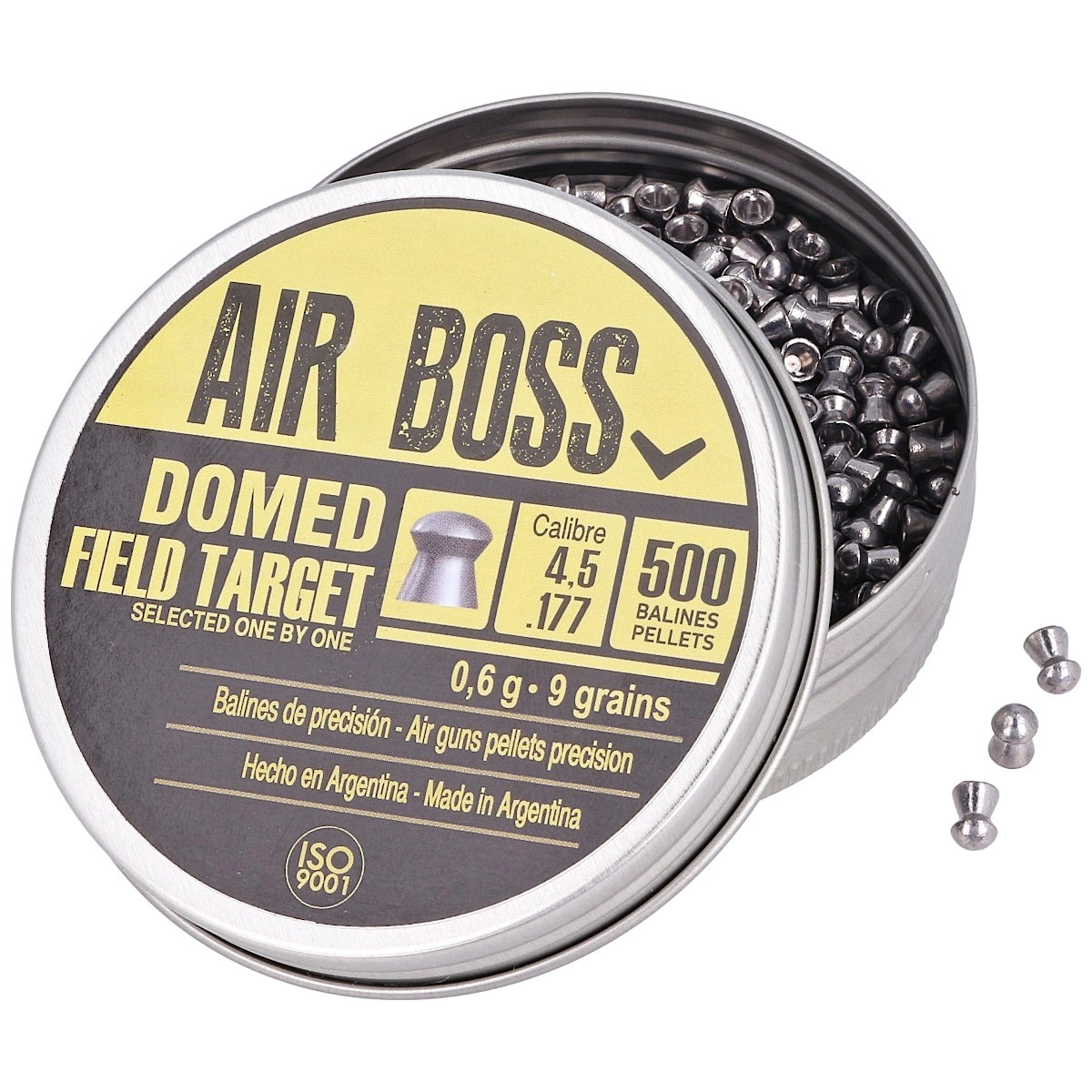 Air Boss Domed Field Target .177 selekcjonowany sztuka po sztuce (Selected One by One) precyzyjny, nadkalibrowy śrut klasy Premium w kalibrze 4.51 mm (lepiej wypełnia przewód lufy, mocniej podkręca się na gwincie, uzyskuje większy zasięg) i współczynniku balistycznym (Ballistic Coefficient) BC: 0.024. Bardzo szybki, zaprojektowany do strzelania na zawodach sportowych Field Target, HFT (zapewnia doskonałe skupienie) oraz do polowań na szkodniki - idealny śrut destrukcyjny oraz do rozbijania celów. Metalowe pudełko, 500 sztuk.