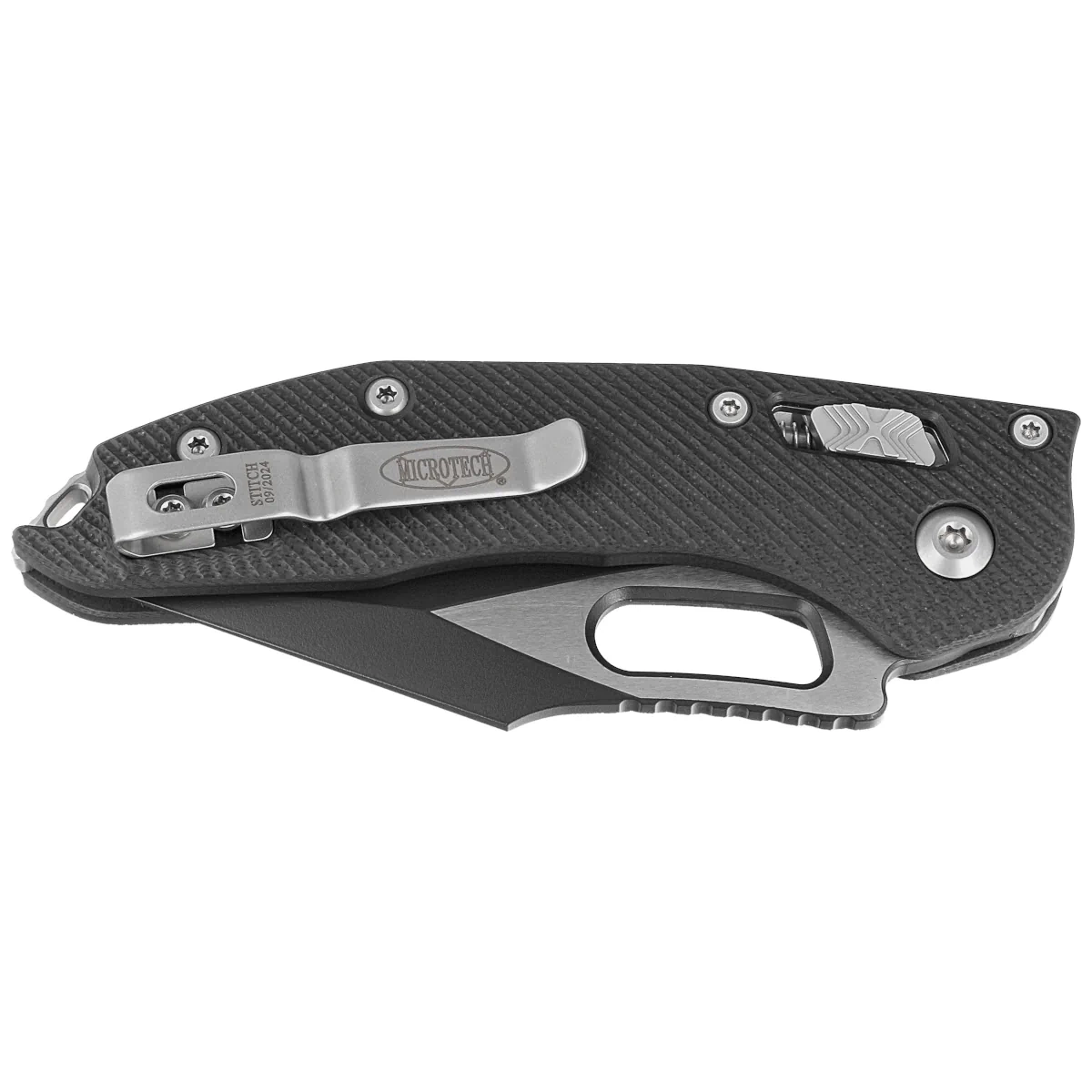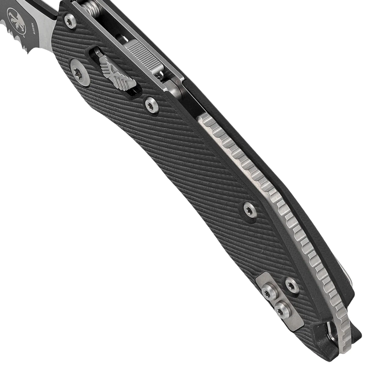 Rękojeść - wykonana na frezarkach CNC z najwyższą precyzją, z kompozytu G-10, z głęboko frezowaną, trójwymiarową strukturą 3D Fluted. Szeroki suwak blokady z charakterystyczną dla firmy Microtech schodkową strukturą (X Button) zapewnia pewną i komfortową obsługę. Okładziny połączono solidnym, aluminiowym backspacerem. Dwustronny (prawa / lewa) klips umożliwia na dyskretne przenoszenie noża w pozycji tip-up. Wystający fragment backspacera z otworem na linkę, może również służyć za improwizowany zbijak do bicia szkła.