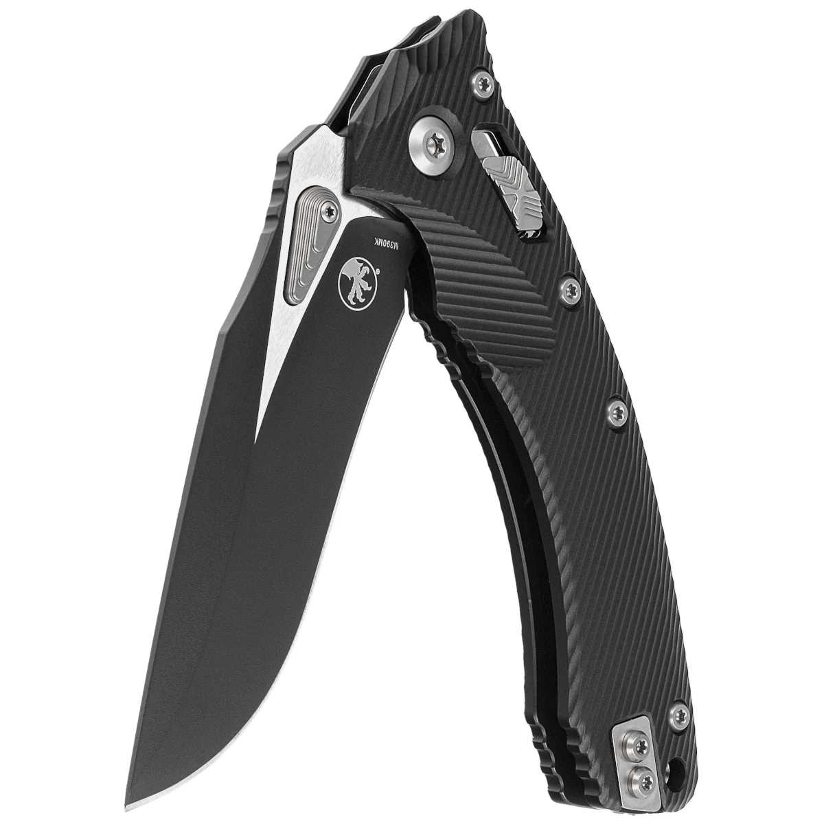 Rękojeść - wykonana z doskonałą precyzją w technologii 3D na frezarkach CNC, z pokrytego czarną powłoką Mil-Spec aluminium 6061-T6, dla lepszego uchwytu pokryta wyfrezowanymi liniami (Fluted). Szeroki suwak blokady z charakterystyczną dla firmy Microtech schodkową strukturą X. Obie okładziny zostały skręcone przy pomocy solidnego, backspacera. Dwustronny (prawa / lewa) tytanowy klips pozwala dyskretnie nosić nóż w pozycji tip-up. Nad klipsem lanyard hole, miejsce na linkę zabezpieczającą lub ozdobną.