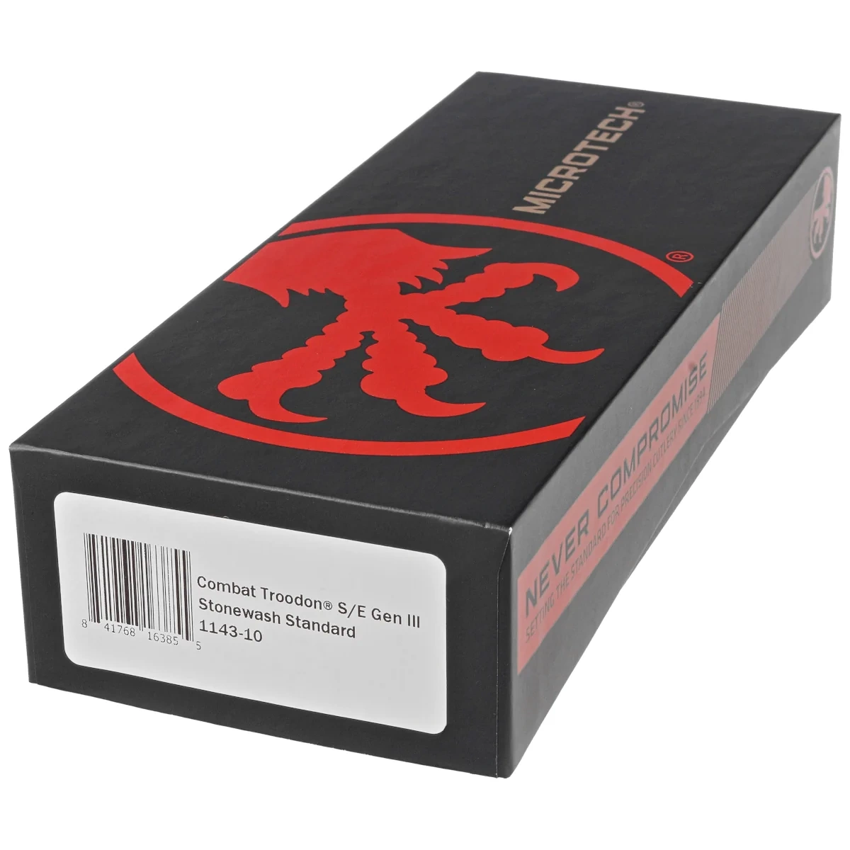 Combat Troodon Gen III S/E Black Aluminium, Stonewashed ten największy z noży automatycznych, to szczyt precyzyjnej inżynierii i taktycznej sprawności w dziedzinie noży OTF (Out The Front). Zbudowany z myślą o szerokim spektrum zastosowań użytkowych, może pochwalić się większym o 25% rozmiarem w porównaniu do flagowego Troodona. Precyzyjnie wykonany, wyposażony w wyrafinowany i piekielnie szybki mechanizm wysuwający ostre jak brzytwa ostrze. W 100% wyprodukowany i zmontowany w USA. Projekt Anthony'ego Marfione, knifemakera i właściciela Microtech Knives.