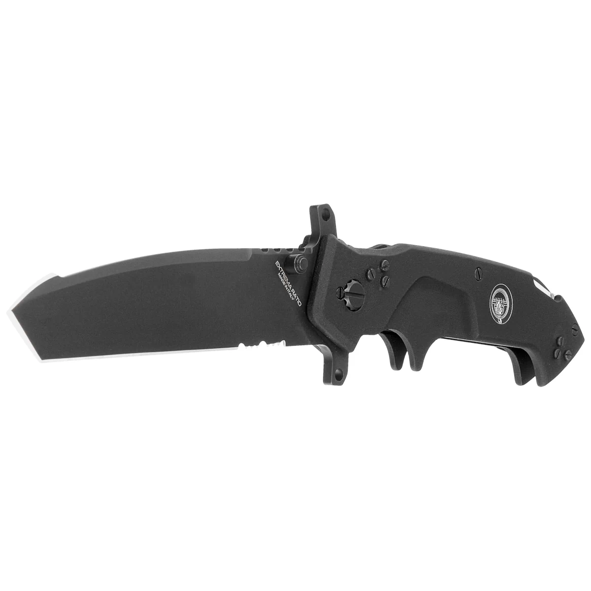 Głownia - masywna z obusiecznym zmodyfikowanym kształtem Tanto, zapewnia ponadprzeciętne właściwości tnące i penetrujące. Klingę pokryto czarną, polerowaną chemicznie, nierefleksyjną powłoką MIL-C-13924 BURNISHING. Ostrze częściowo ząbkowane Combo wyprowadzono szlifem płaskim pełnym (Full Flat grind) który zapewnia wytrzymałość, doskonałą geometrię krawędzi tnącej oraz ekstremalną wydajność cięć materiałów tekstylnych, twardych tworzyw sztucznych, włóknistych. Podwójny system blokady głowni: solidny mechanizm Liner-Lock wspomagany przez dodatkową blokadę. Stalowy obustronny jelec po złożeniu klingi działający jak Flipper lub jak hak Emerson uzupełniono o kołek Thumb Stud tworząc potrójny system szybkiego otwarcia noża.