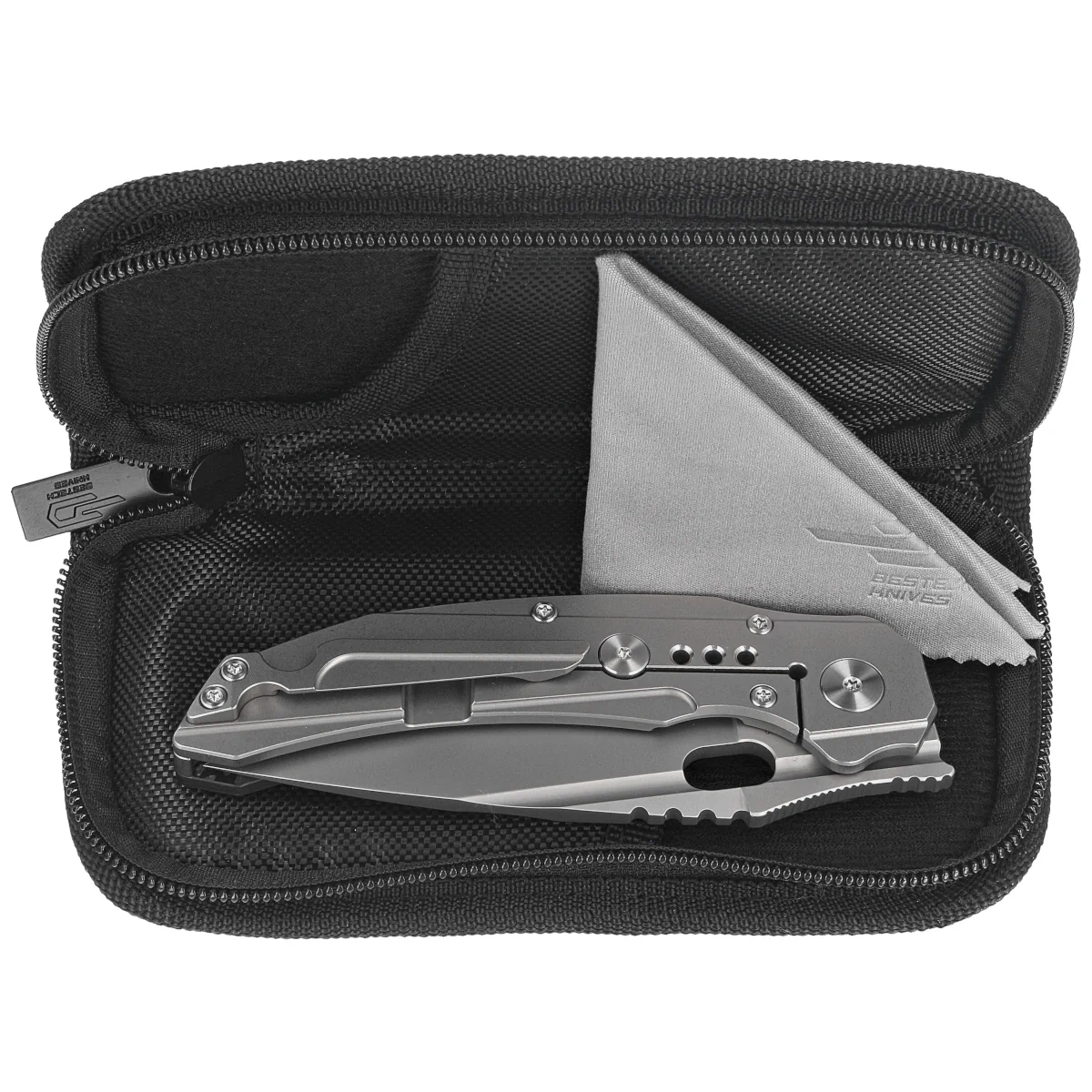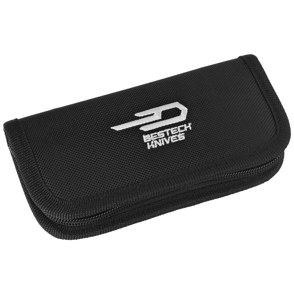 Futerał - nóż zapakowano w zapinany zamkiem nylonowy miękki pouch z logo marki służący do bezpiecznego przenoszenia i przechowywania foldera.